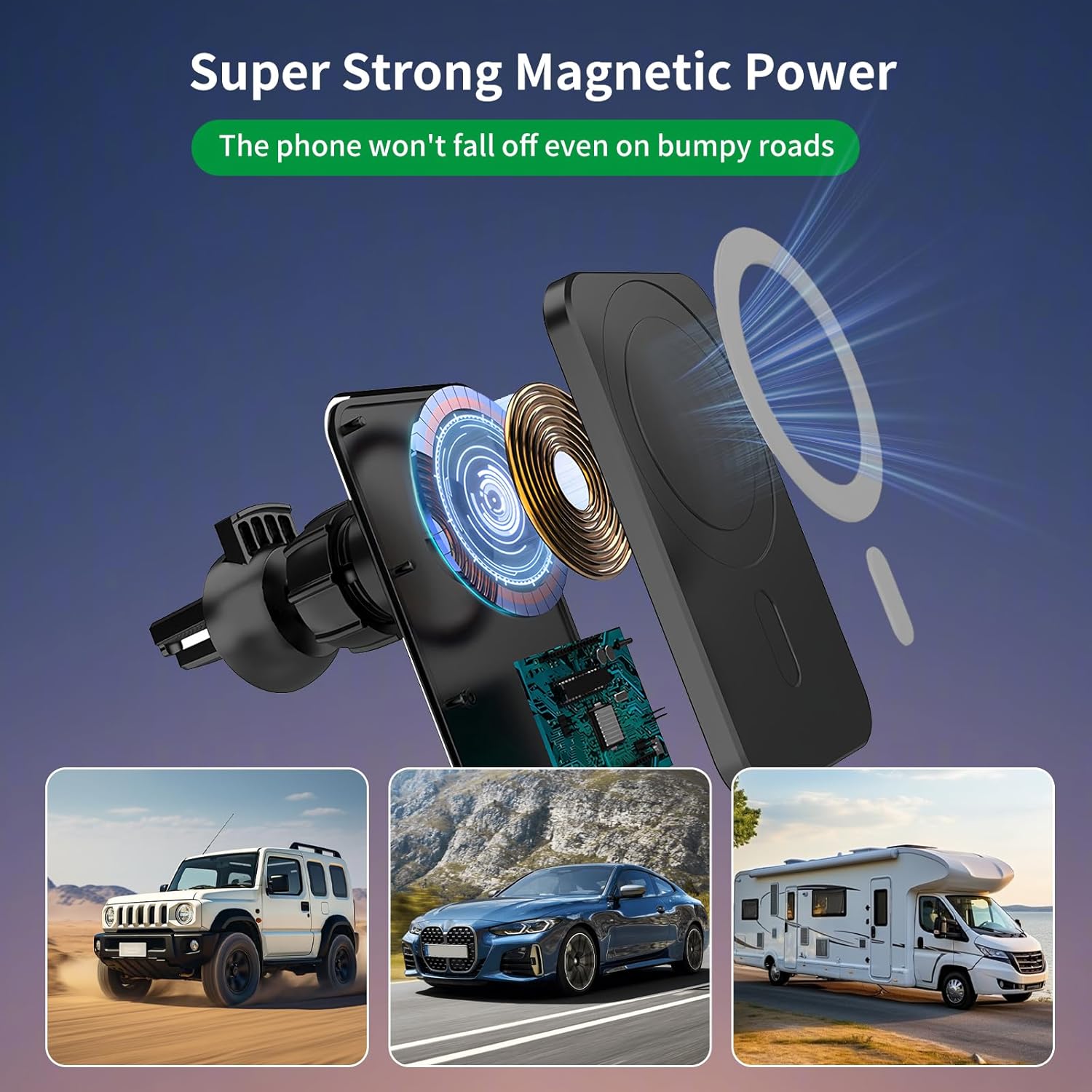 Wireless Charger: The magnetic car charger holder supports 15W wireless fast charging, faster charging speed, and it is equipped with intelligent heat sensing system, which can protect your phone from overcharging, over-current, over-voltage, overheating and short-circuiting to ensure the safety of your phone.