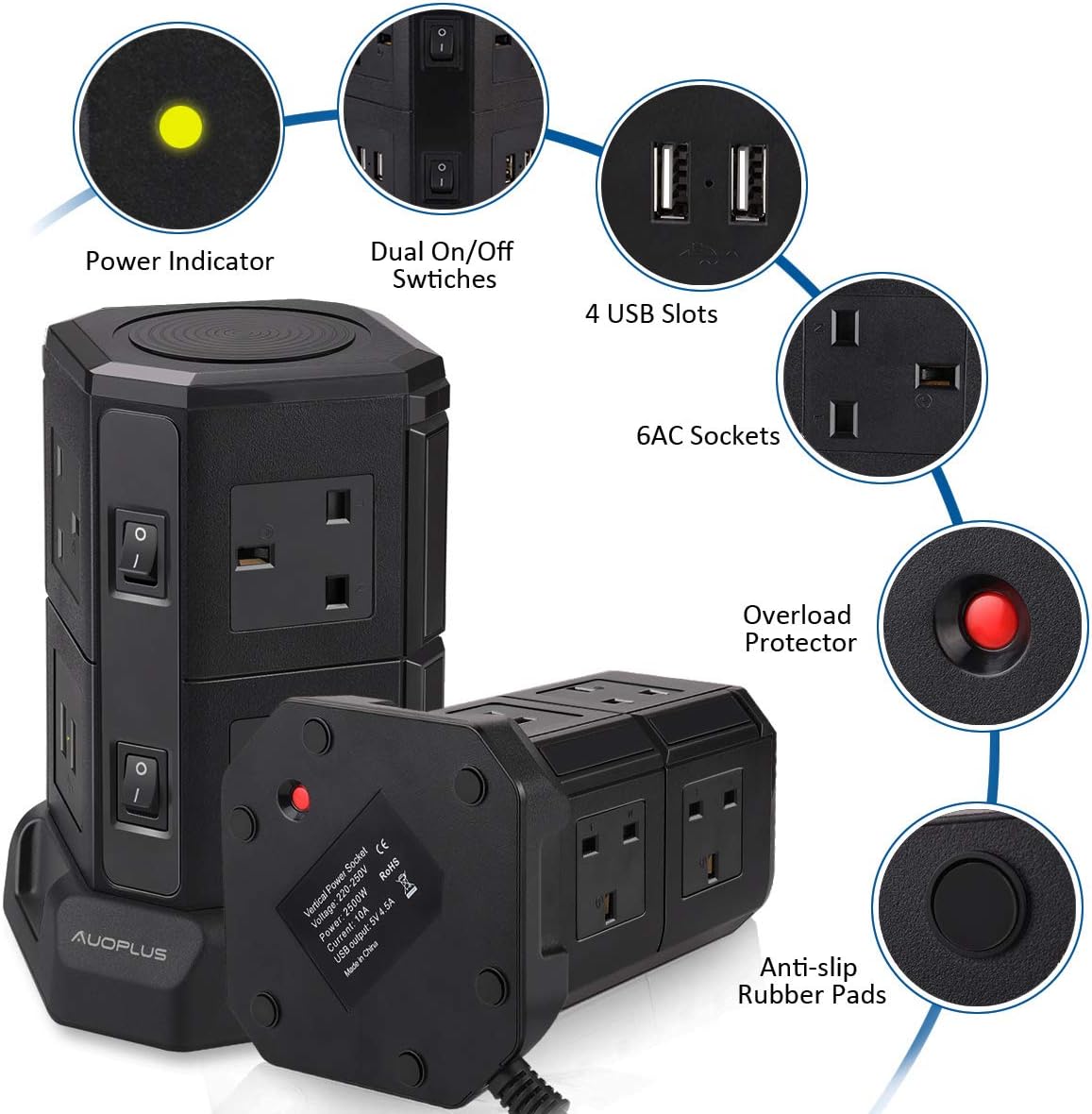 📣 Multi Plug Extension Leads – AUOPLUS power strip comes with 6 AC outlets and 4 USB ports , supports wide voltage 220V-250V, maximum output power is 3250W. The 3250W rated power copper core cable allows all the outlets and USB port simultaneously works without a break, Can meet your daily electricity needs, Perfect for home and office