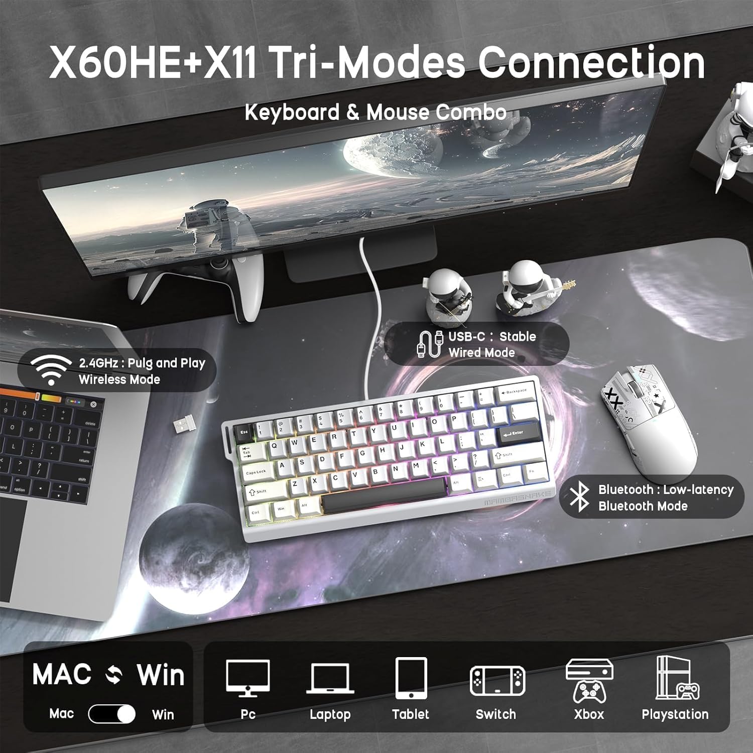【Tri-Mode Connectivity & Ultra-Light Design】Enjoy seamless device switching with the X11 superlight mouse and X60HE compact keyboard, both featuring tri-mode connectivity (USB-C, 2.4GHz, and Bluetooth). Weighing just 59g±3g, the X11 mouse enables effortless, fluid movement, while the X60HE keyboard’s 60% layout (QWERTY) maximises desk space without compromising gaming functionality.