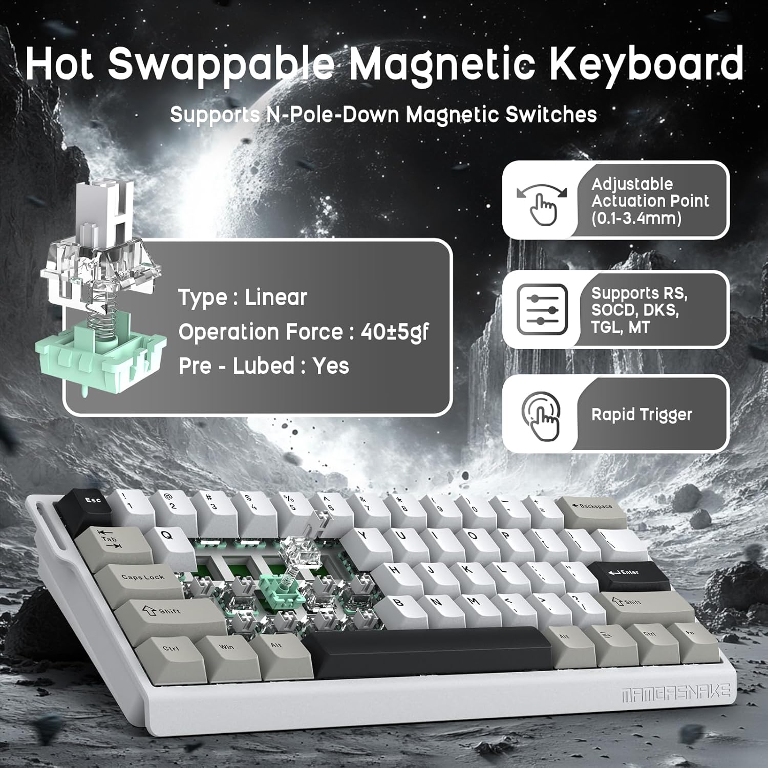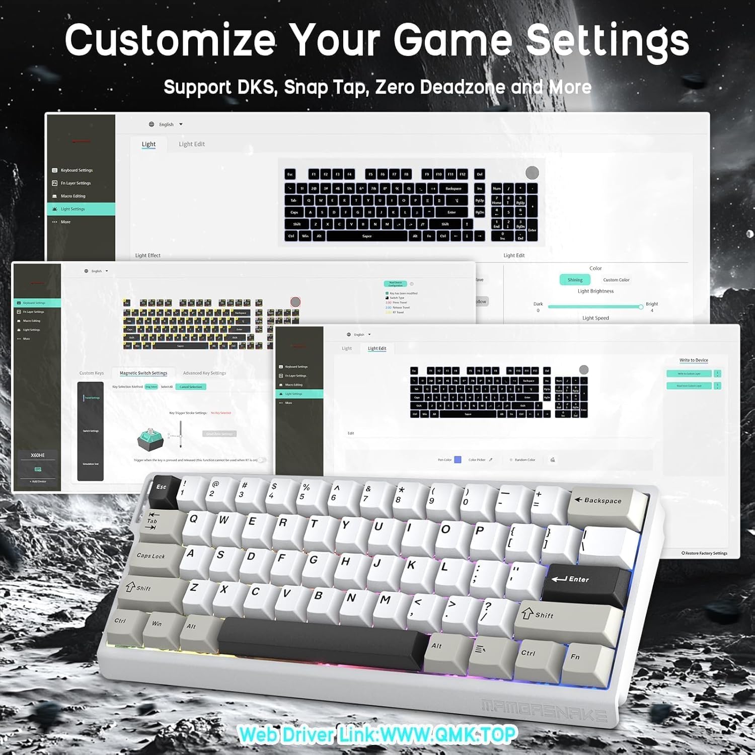 【Hall Effect Magnetic Switches】The X60HE mechanical keyboard is equipped with Hall Effect magnetic switches, offering adjustable actuation from 0.1mm to 3.4mm for unmatched accuracy and personalised control. With a blazing-fast 8000Hz polling rate in wired mode and an ultra-responsive 0.125ms response time, every keystroke registers with pinpoint precision, keeping you ahead in the most intense gaming and typing sessions.
