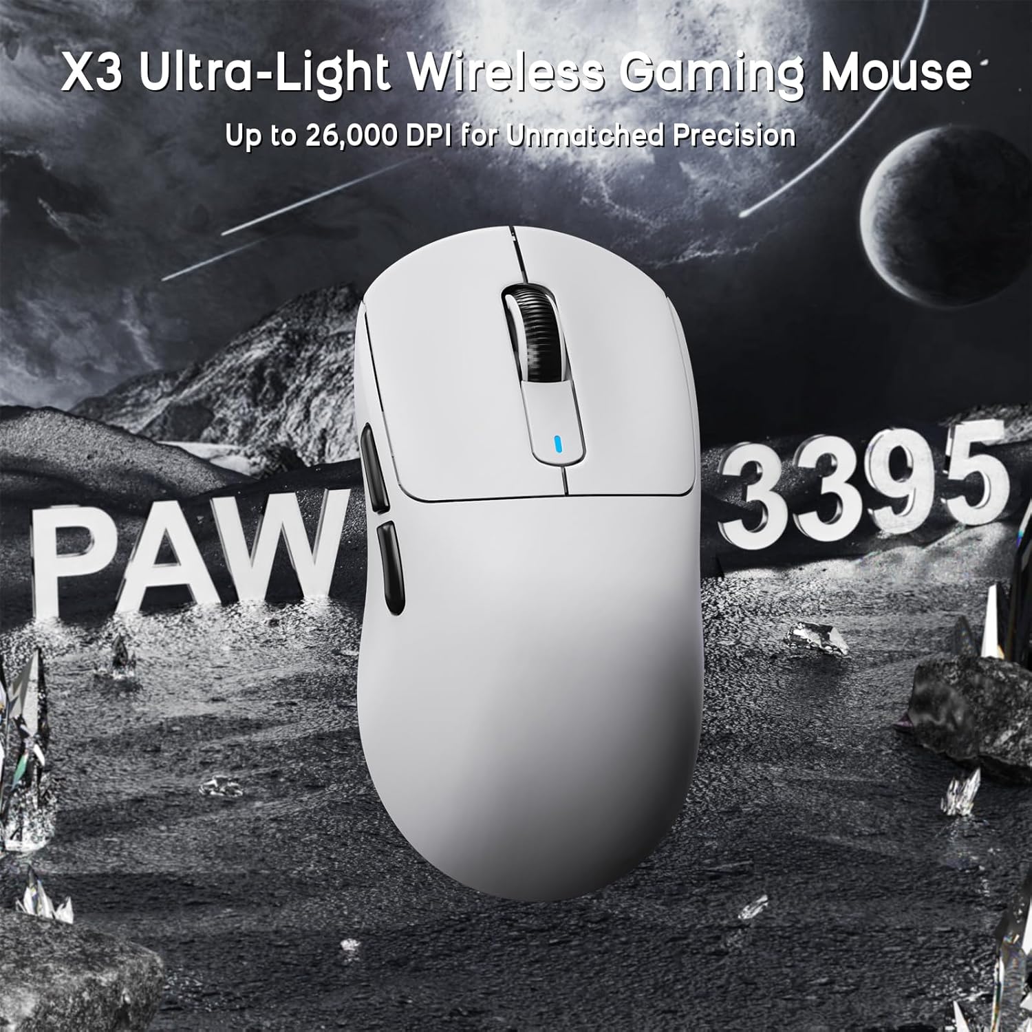 【PAW3395 Sensor & 26,000 DPI】The X3 wireless mouse features the high-performance PixArt PAW3395 sensor, offering up to 26,000 DPI, a 1000Hz polling rate, and 50g acceleration for ultra-responsive gameplay. With included grip tape, it delivers enhanced control and stability during high-speed manoeuvres, while ensuring precision for detailed tasks—balancing comfort and competitive accuracy.
