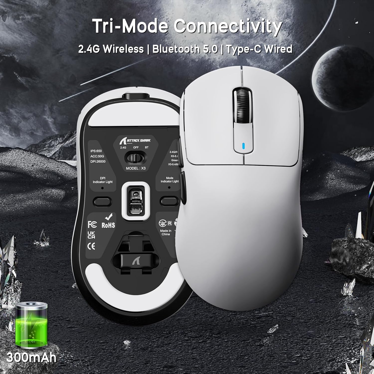 【Tri-Mode Connectivity Mice & Lightweight】The X3 mouse supports tri-mode connectivity—USB-C, 2.4GHz, and Bluetooth—for flexible switching across devices. Weighing just 49g, it enables faster and more precise control for quicker aim, rapid flicks, and smoother tracking. Powered by a 300mAh battery, it offers up to 200 hours of use on a single charge.