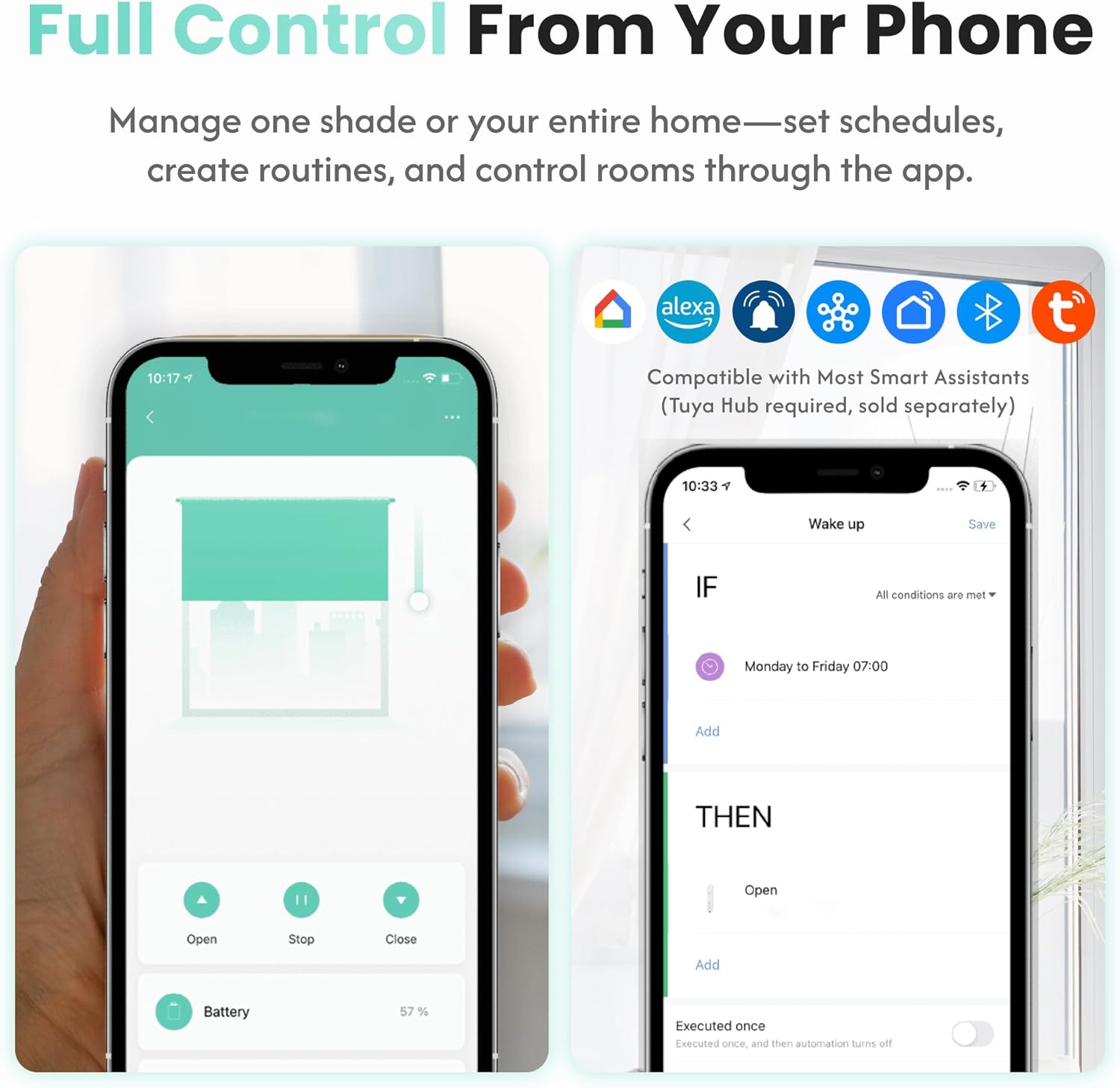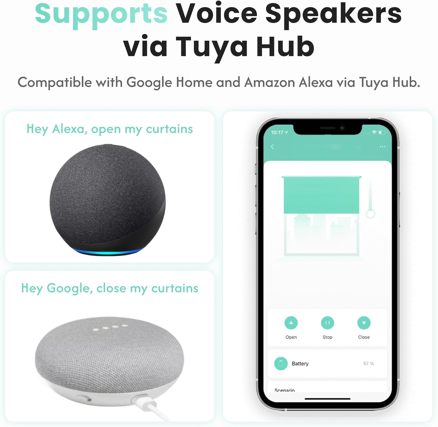 SIMPLE SETUP: Our smart shade driver is Bluetooth-enabled; with the additional TUYA Hub (sold separately), it is compatible with Alexa Google Assistant & IFTTT; and for remote control features & scheduling