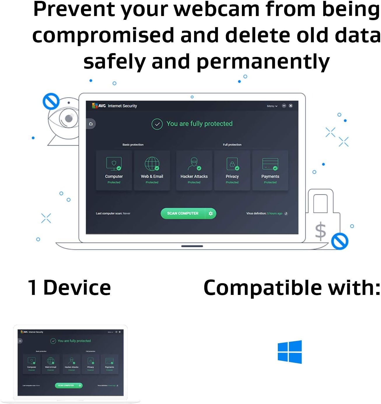 Get safely through the internet with AVG Internet Security. The powerful AI scans for malware and proactively protects against threatening software. If suspicious behaviour is detected in the system, the behavioural protection immediately triggers a warning message. When shopping online, the antivirus software also checks whether it is a fake site. This prevents important address and bank data from being passed on to fraudsters. The integrated firewall reliably protects against hacker attacks. This way, the private webcam as well as personal photos and videos are also safe from access.