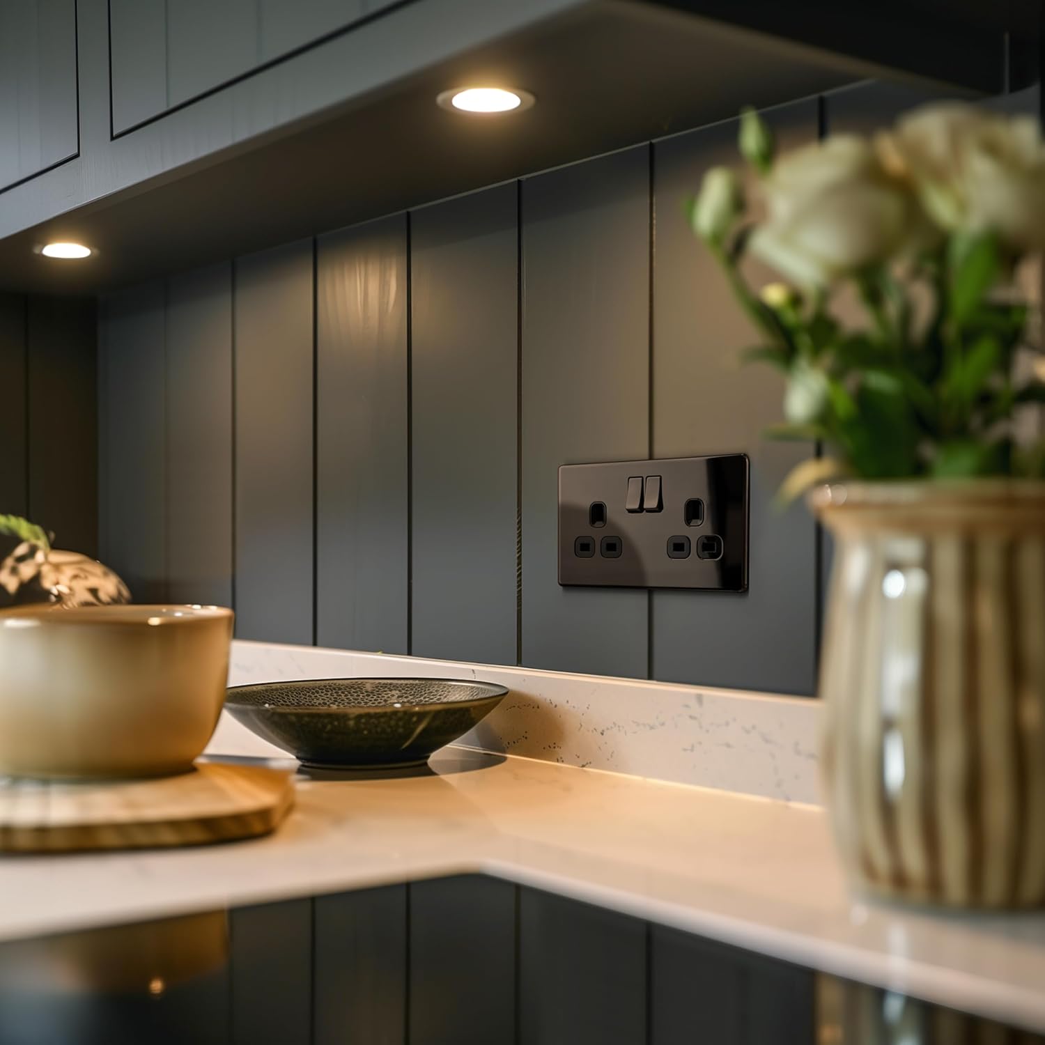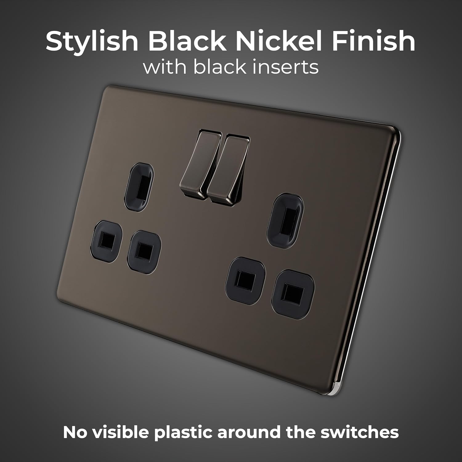 SCREWLESS SLIMLINE BLACK NICKEL DOUBLE SWITCHED POWER SOCKET: From BG Electrical, has softly rounded corners with a screwless flatplate and low profile– giving a clean look that exudes modern elegance