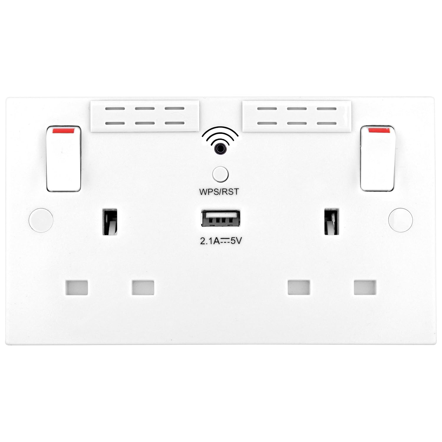 CLASSIC SQUARE EDGED WHITE MOULDED DOUBLE POWER SOCKET WITH WI-FI EXTENDER: From BG Electrical, this socket has square edges and screw cover caps for a sleek and classic look. Minimum mounting box depth is 25mm, ideal for retro-fit