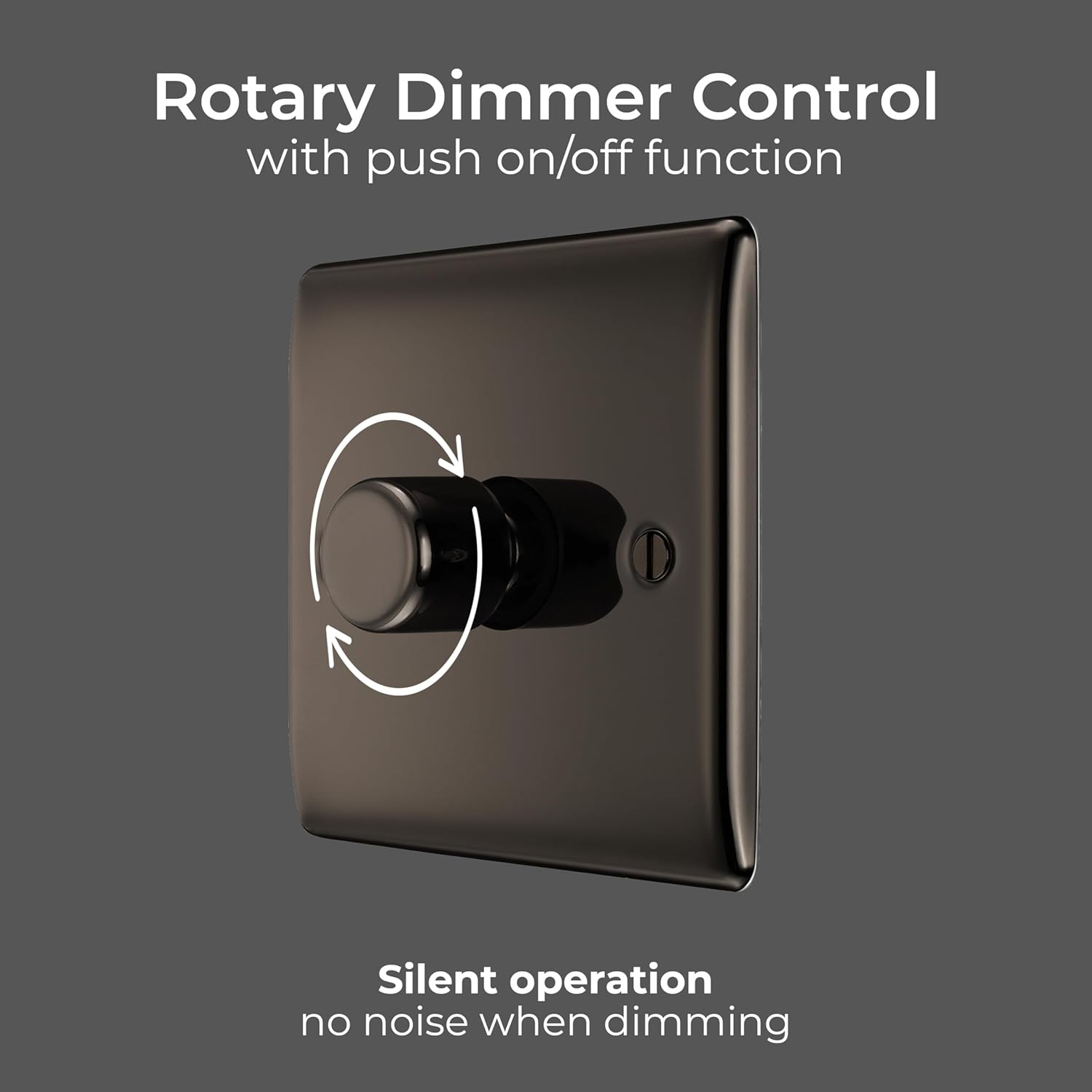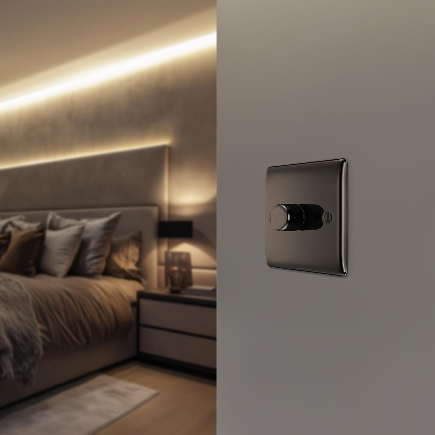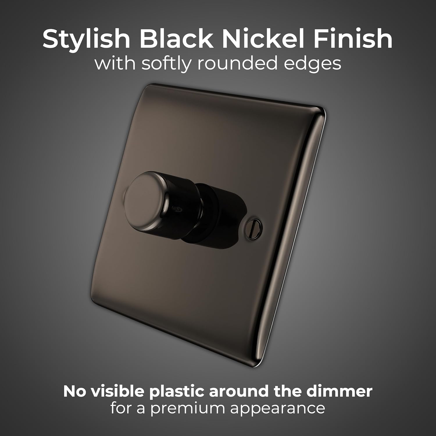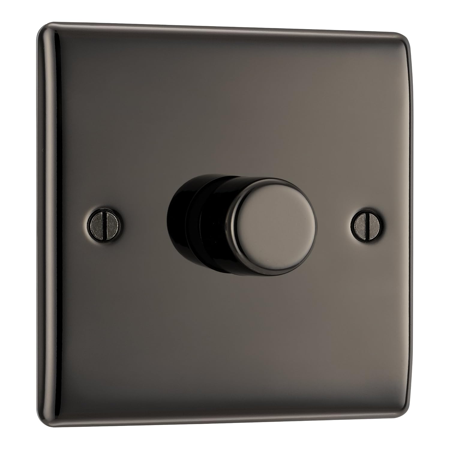 DECORATIVE SINGLE DIMMER SWITCH WITH RAISED PROFILE FROM THE BG NEXUS METAL RANGE: Slim, raised profile with softly rounded corners in black nickel, with colour matching fixing screws for a super-stylish design