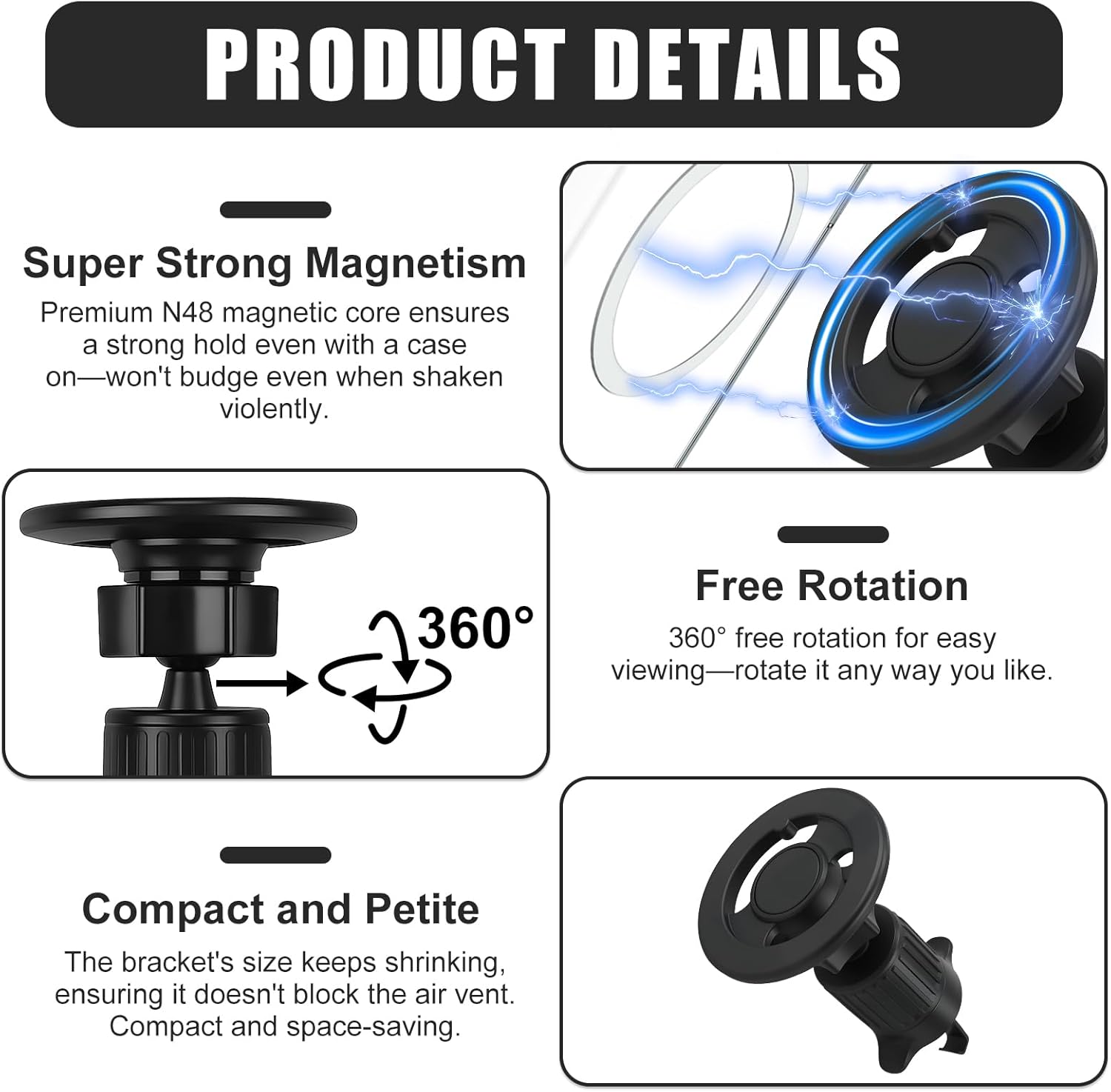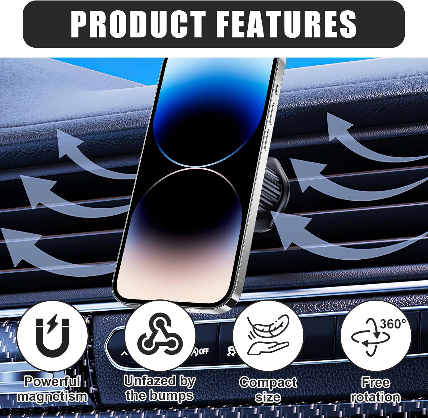 Upgrade your driving experience with the Car Mount for Air Vent, the perfect accessory for keeping your Phone and other enabled devices secure while on the go. Featuring powerful magnets, this magnetic phone holder ensures your device stays in place, even on bumpy roads, and provides a stable platform for hands-free driving. Whether you’re driving to work, on a road trip, or running errands, this phone holder is designed to make your life easier.Powerful Magnets for Extra SecurityAt the heart of this car mount are high-performance magnets that provide exceptional magnetic strength. These magnets create a secure connection, ensuring your Phone stays put no matter how bumpy the ride gets. The strong magnet system also prevents your phone from falling or shifting during sudden stops or sharp turns. No more worrying about your phone slipping out of its holder or needing constant adjustments during drives.Air Vent Compatibility with Stable StructureThis mount is designed to work with most air vent types. The air vent compatibility allows you to easily install it in any car. Once attached, the car holder forms a stable triangular structure that firmly holds your phone, reducing the risk of movement or vibrations. The secure fit ensures your device won’t slip or sway, giving you peace of mind on every journey. However, round air outlets or shutter-style air vents are not compatible with this mount, so please verify the type of air vent in your vehicle before purchasing.Sleek, Compact, and Stylish DesignNot only does the car mount offer impressive functionality, but it also boasts a sleek, compact design that seamlessly blends into your car’s interior. The black finish gives it a modern and minimalistic aesthetic, complementing any vehicle interior without distracting from the design of your car. Its compact size ensures it doesn’t take up unnecessary space, making it an unobtrusive addition to your dashboard or air vent.One-Handed Operation for ConvenienceThis phone holder features magnetic technology that allows for one-handed operation. Simply place your Phone near the mount, and it will securely attach in seconds. No need to fumble with clips or complicated mounting systems—just position your phone, and it’s held firmly in place. This hands-free approach allows you to maintain focus on the road, improving safety and convenience while driving.Durability and Rigorous TestingWe understand the importance of durability, especially for products used regularly. That’s why this ar phone holder undergoes rigorous testing. Each mount is subjected to tests simulating everyday use to ensure it can withstand the rigours of constant installation and removal. The materials and design are consistently upgraded to offer long-lasting reliability, making this an essential and practical accessory for your car.