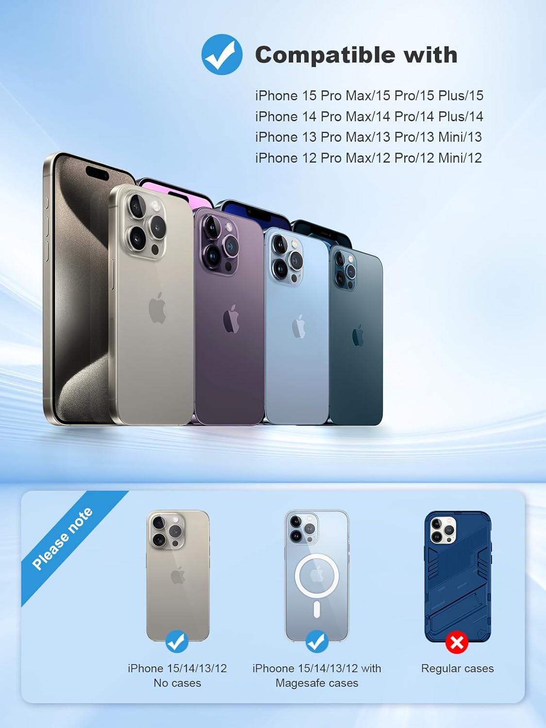 Compatible with iPhone Series: This car phone stand allows for wireless charging compatible with iPhone 17/17 Air/17 Pro/Pro Max/16/16 Plus/16 Pro/Pro Max/15/15 Plus/15 Pro/Pro Max/14/14 Plus/14 Pro/Pro Max/iPhone 13/13 Pro/13 Pro Max/13 Mini/12/12 Pro/12 Pro Max/12 Mini. Please remove metal/magnetic accessories before use to avoid interference