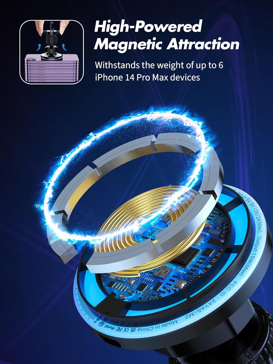 Ultra Strong Magnetic Suction: The car wireless charger is equipped with 14 super strong N52 magnets whose magnetic force is up to 1.2kg so as to hold 6 iPhone 15 Pro Max at the same time, helping keep your phone secure even on bumpy roads. N52 magnets not only possess strong magnetic force but also demonstrate super durability
