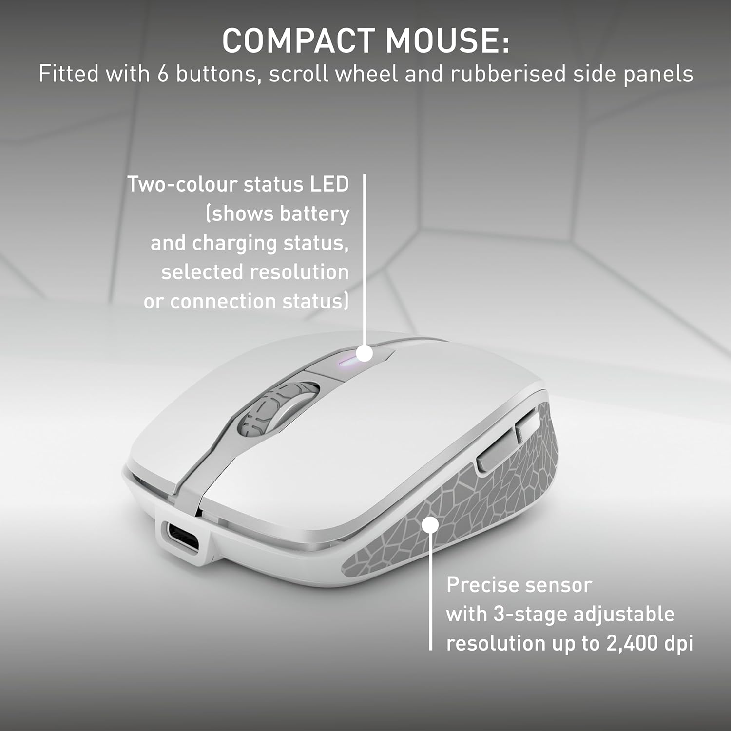 Mouse: 6 buttons, rubberised side panels, compact shape, precise sensor with 3-stage adjustable resolution up to 2,400 dpi + magnetic storage option for USB dongle