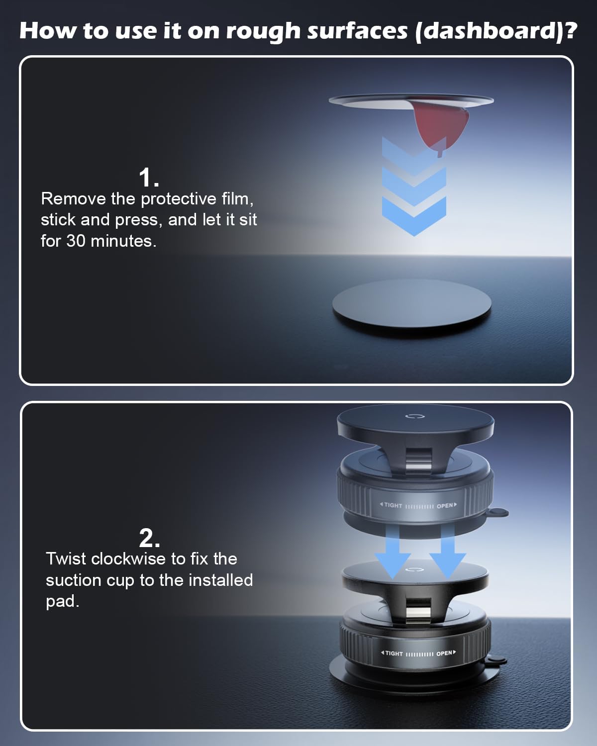 【One-touch Adsorption, Easy Removal】Suction cups do not require charging, just turn the base knob to instantly generate strong vacuum suction, firmly adsorbed on the surface. When disassembling, rotate it in the opposite direction, no need to exert force, no residual adhesive left, keep the surface clean. Simple design allows you to quickly switch between different vehicles and enjoy a convenient driving experience at any time