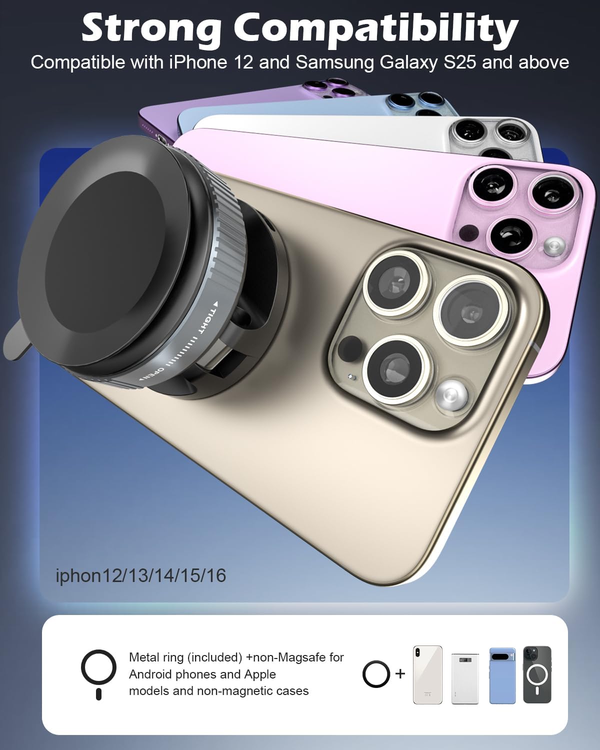 【Phone Compatibility】Perfectly compatible with all iPhone 16/15/14/13/12 series, covering all Pro, Max, and Mini models. Also supports Android devices with 15W wireless charging when used with magnetic cases under 3mm thick. Important Note: Adhesive metal rings are not recommended, as installation misalignment may cause positioning errors and prevent charging.
