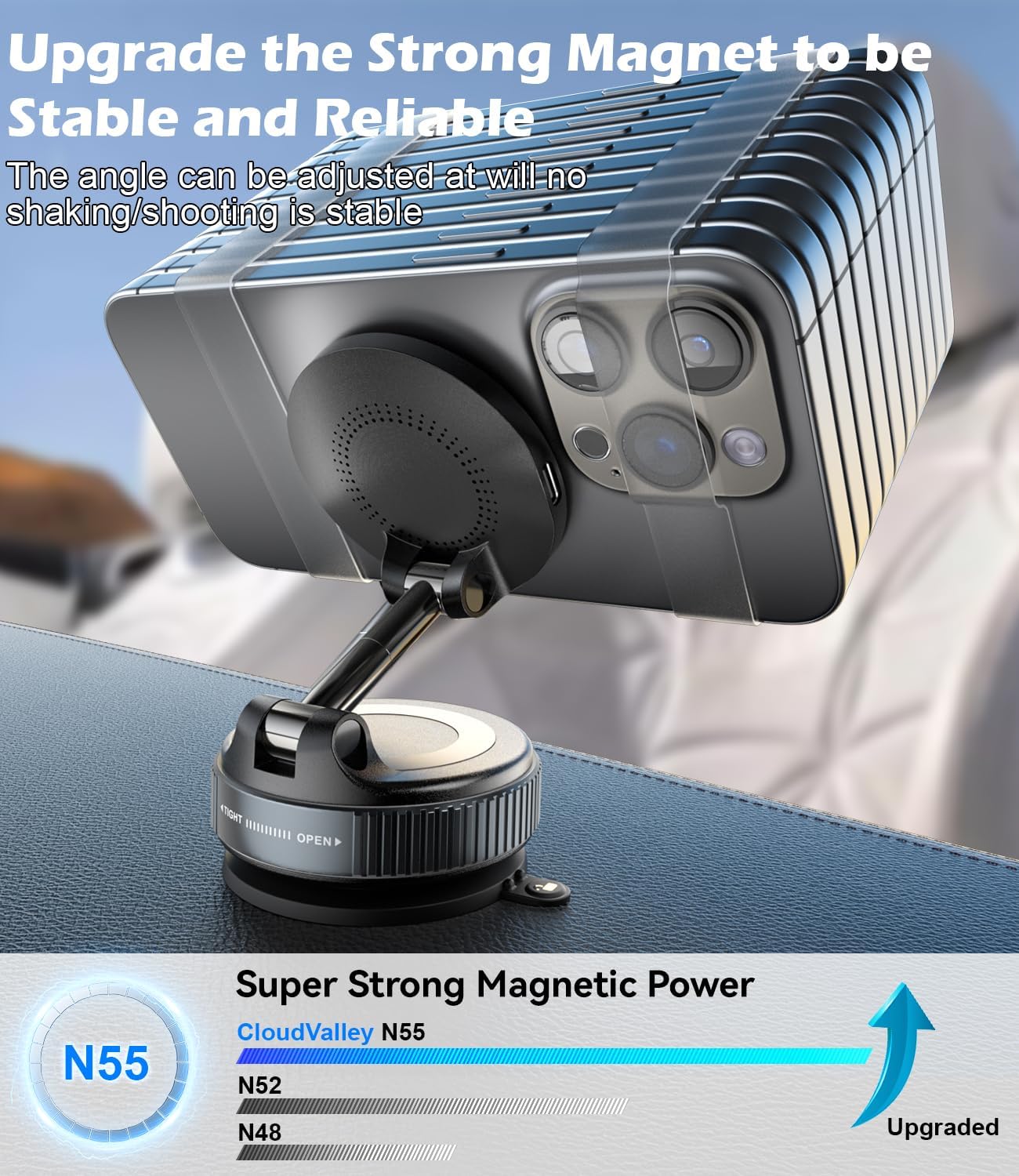 This upgraded magnetic car mount with wireless charging is built for a secure and effortless driving experience. Featuring a next-generation gel-based vacuum suction cup, it sticks firmly to textured, curved, or rough surfaces like dashboards and matte plastic—no extra base needed. The heat-resistant design ensures long-lasting, reusable hold in all conditions. Equipped with smart chip technology, it delivers up to 15W fast wireless charging with precise alignment, battery protection, and efficient heat management. Compatible with MagSafe iPhone 12–16 models and other magnetic wireless devices, just snap your phone on and power up instantly. Premium N55 magnets provide 200% stronger hold than standard magnets, keeping your phone steady even on bumpy roads, sharp turns, or sudden braking. The 360° rotation and 180° foldable metal arm let you adjust the perfect viewing angle for GPS navigation, hands-free calls, or streaming. Tool-free installation with a one-twist lock makes setup and removal quick and mess-free. Complete with USB-C charging cable, metal ring, and cleaning kit, this car phone holder is the perfect blend of strong hold, fast charging, and convenience.