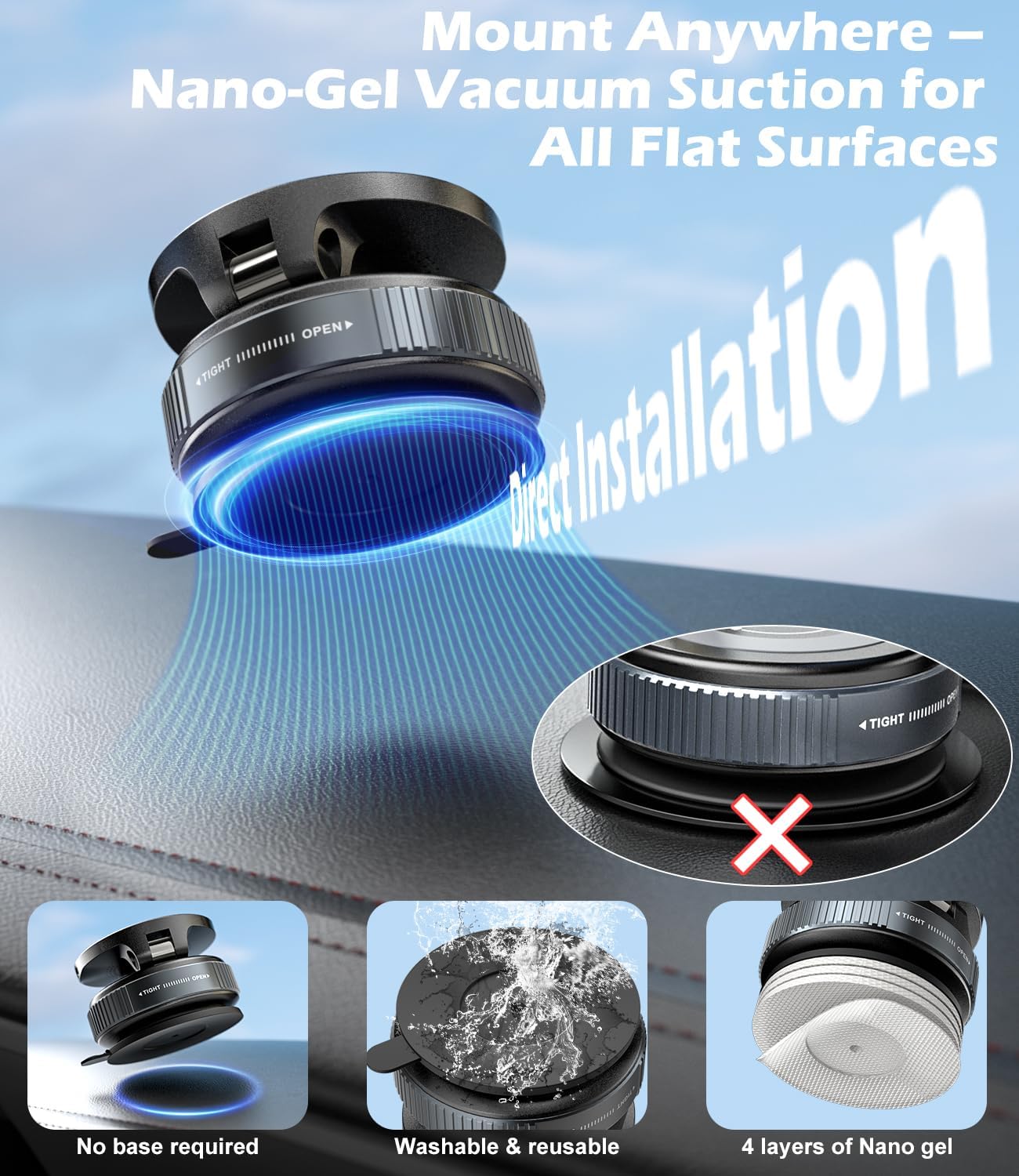 【Tool-Free One-Twist Lock】Quickly install by twisting the base knob to create an instant vacuum seal. Removal is just as easy—simply twist to release. No adhesives, no mess, no damage to your surfaces. Reusable and perfect for switching between vehicles