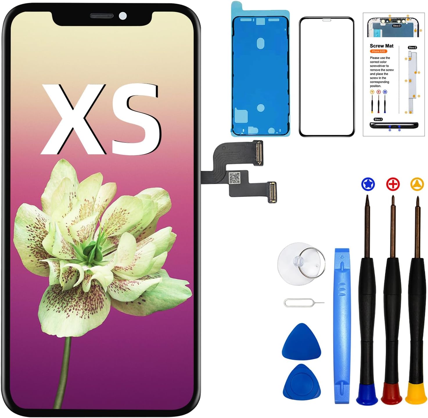 iPhone XS LCD screen replacement + a set of repair tools + waterproof bezel sticker (make your iphone retain its waterproof capacity) + screen protector (no more worrying about scratches and damage, AND anti-fingerprint)