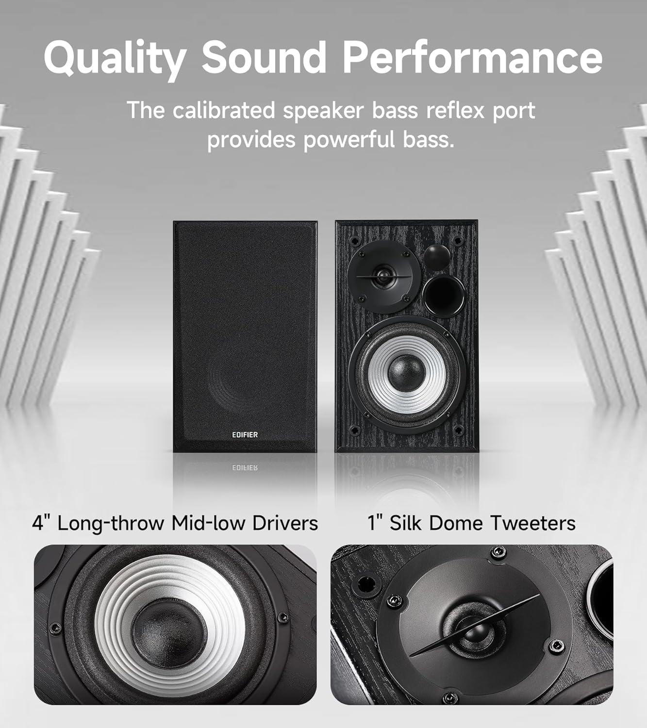 QUALITY SOUND PERFORMANCE: Each speaker cabinet houses one 1-inch silk dome tweeter and one 4-inch long-throw mid-low driver. The calibrated speaker bass reflex port provides powerful bass