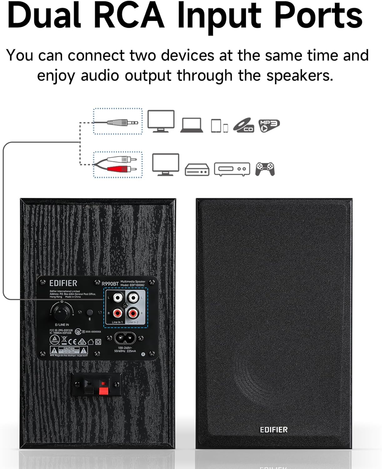 DUAL RCA INPUT PORTS: These PC speakers support simultaneous connection of two devices via RCA audio cables, allowing you to enjoy seamless audio playback from two sources at once