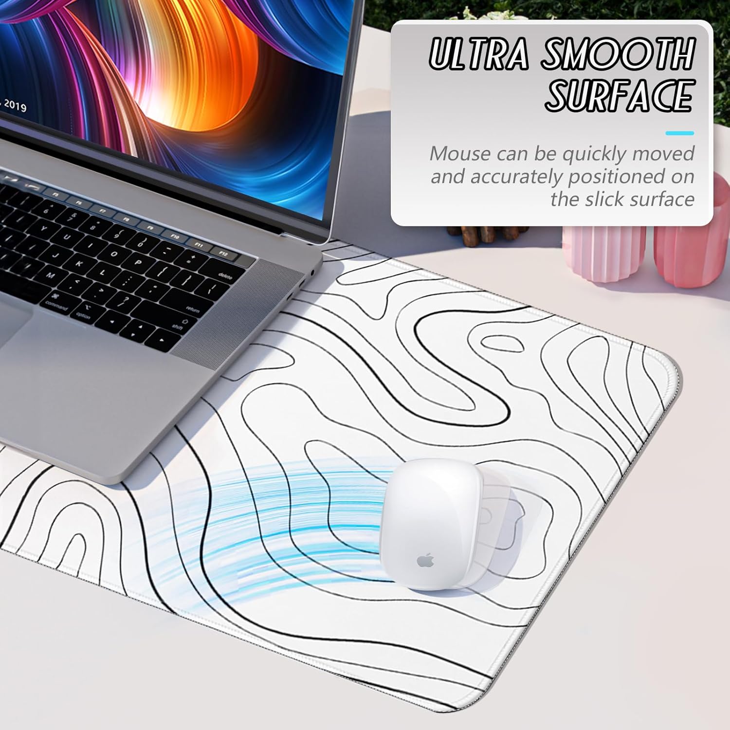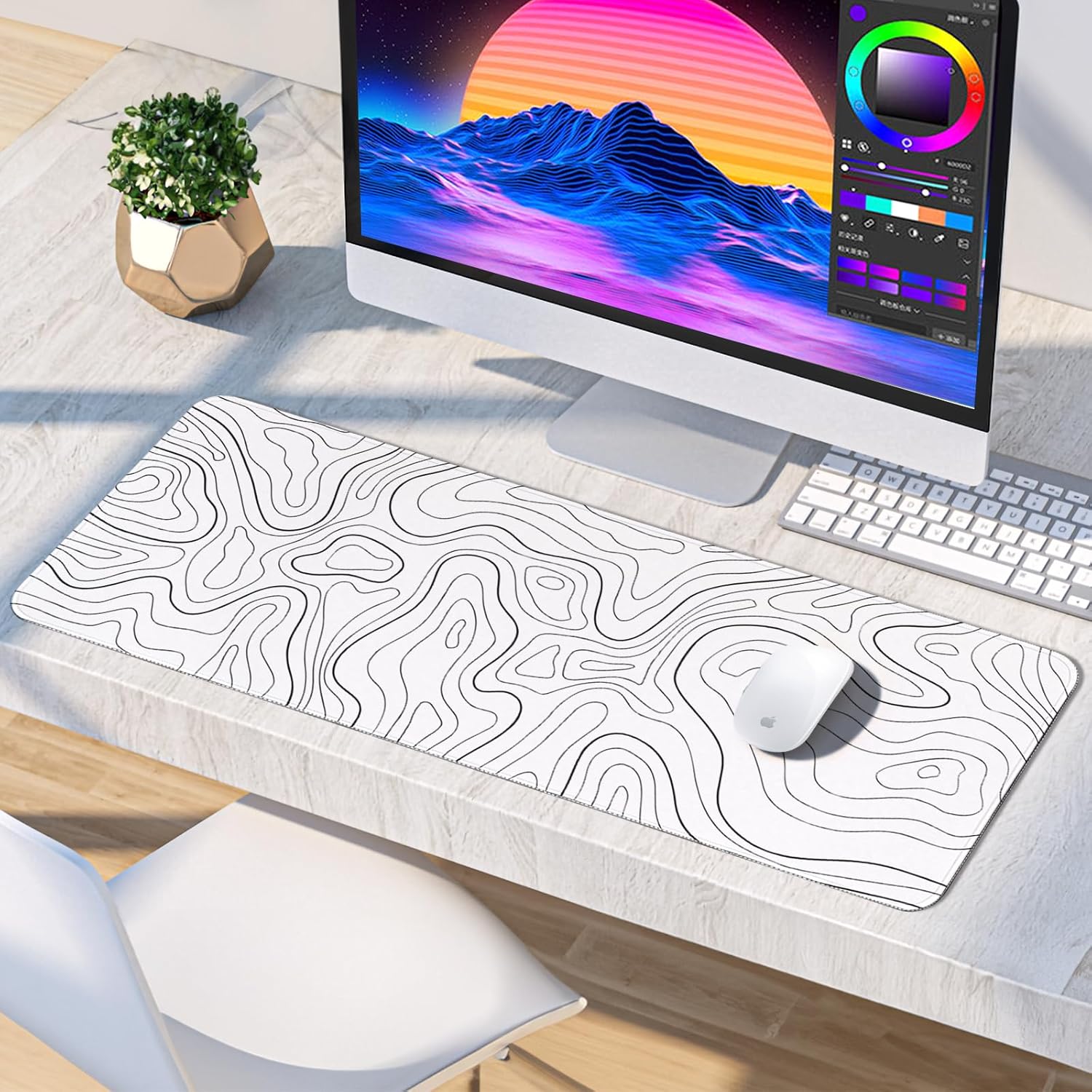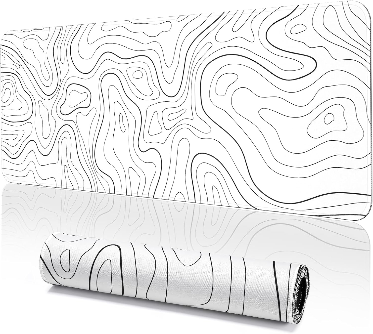 Extended mouse pad or desk mat with topographic line pattern design in white and gray. Positioned on wooden desk surface with computer monitor stand visible.Extended mouse pad or desk mat with topographic line pattern design in white and gray. Positioned on wooden desk surface with computer monitor stand visible.