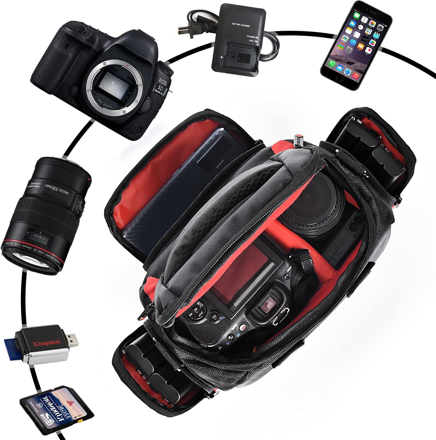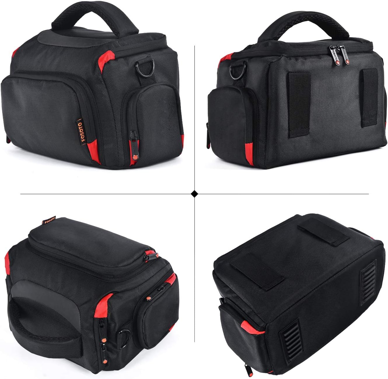 Large interior main pocket with an adjustable Velcro padded divider perfect to store your DSLR Camera, extra lenses, flash and other accessories.2 zippered Side Pockets designed to hold extra Batteries and chargers.Front Zippered large pocket perfect for cables, cleaning supplies and other needed accessories and the mesh pouch inside to store extra SD cards and small accessories.