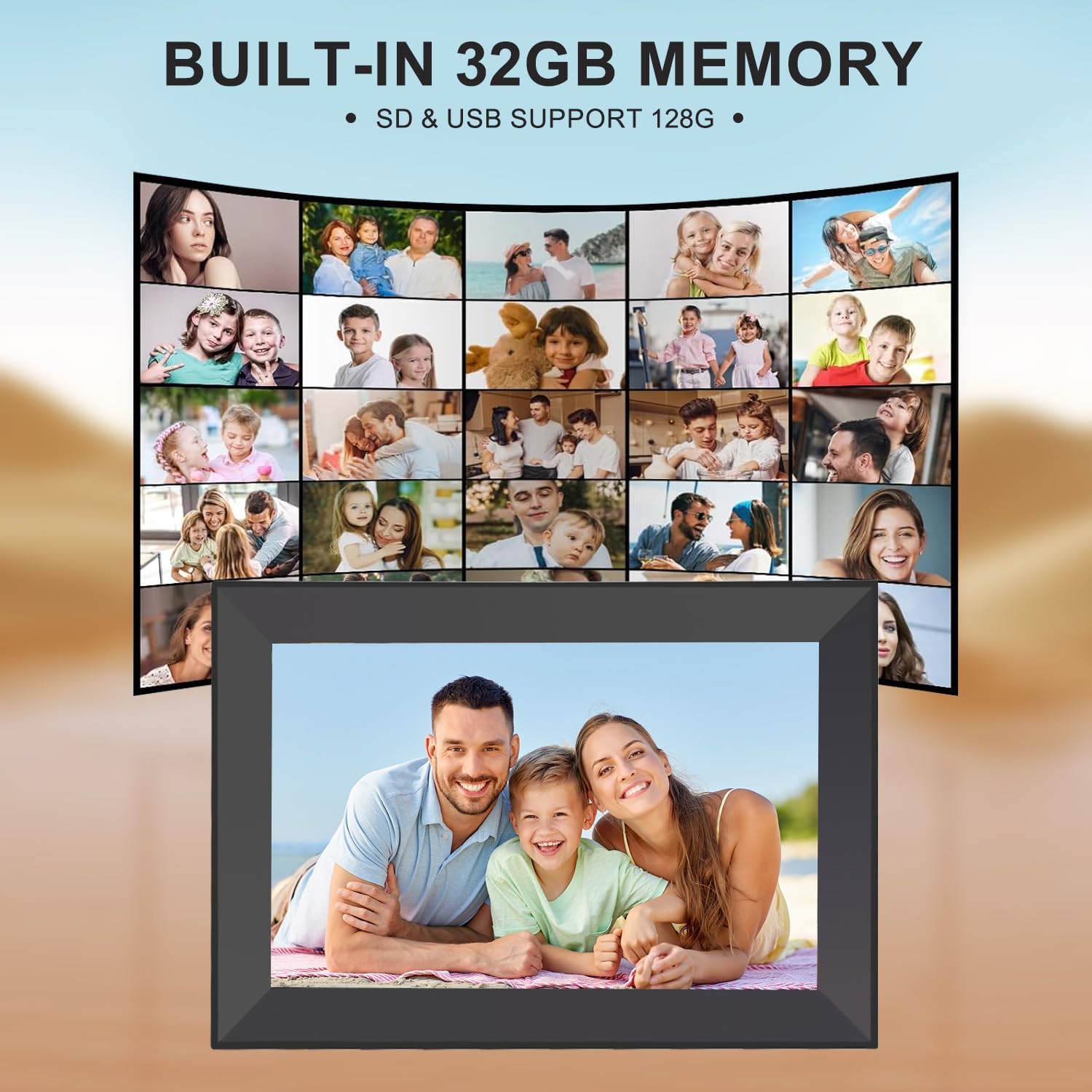 Digital photo frame with 32GB memory capacity, displaying ability to showcase multiple photos in a streaming preview format. 10.1 inch high definition display featuring family on couch. Product icons indicate visual snow protection, IPS technology, and TÜV Rheinland eye comfort certification. aplus content image Digital photo frame displaying a group photo, with '1280*800 HD' text. Frame shown on wooden surface with decorative items. Digital photo frame with high sensitivity touchscreen. Multiple images showcase family and pet photos displayed on the frame.