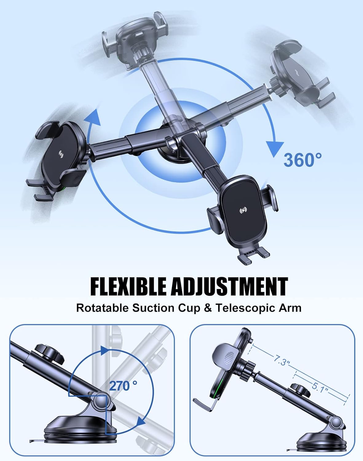 ✅[Flexible Angle Adjustment] Glangeh car phone holder has a unique 360° rotatable suction cup and 360° swivel ball joint, adjust the angle as you like to achieve the best viewing angle. And the telescopic arm can be extended from 5.1″ to 7.3″ or swivel up and down, you can adjust the distance according to your needs and enjoy a safer and easier driving experience!