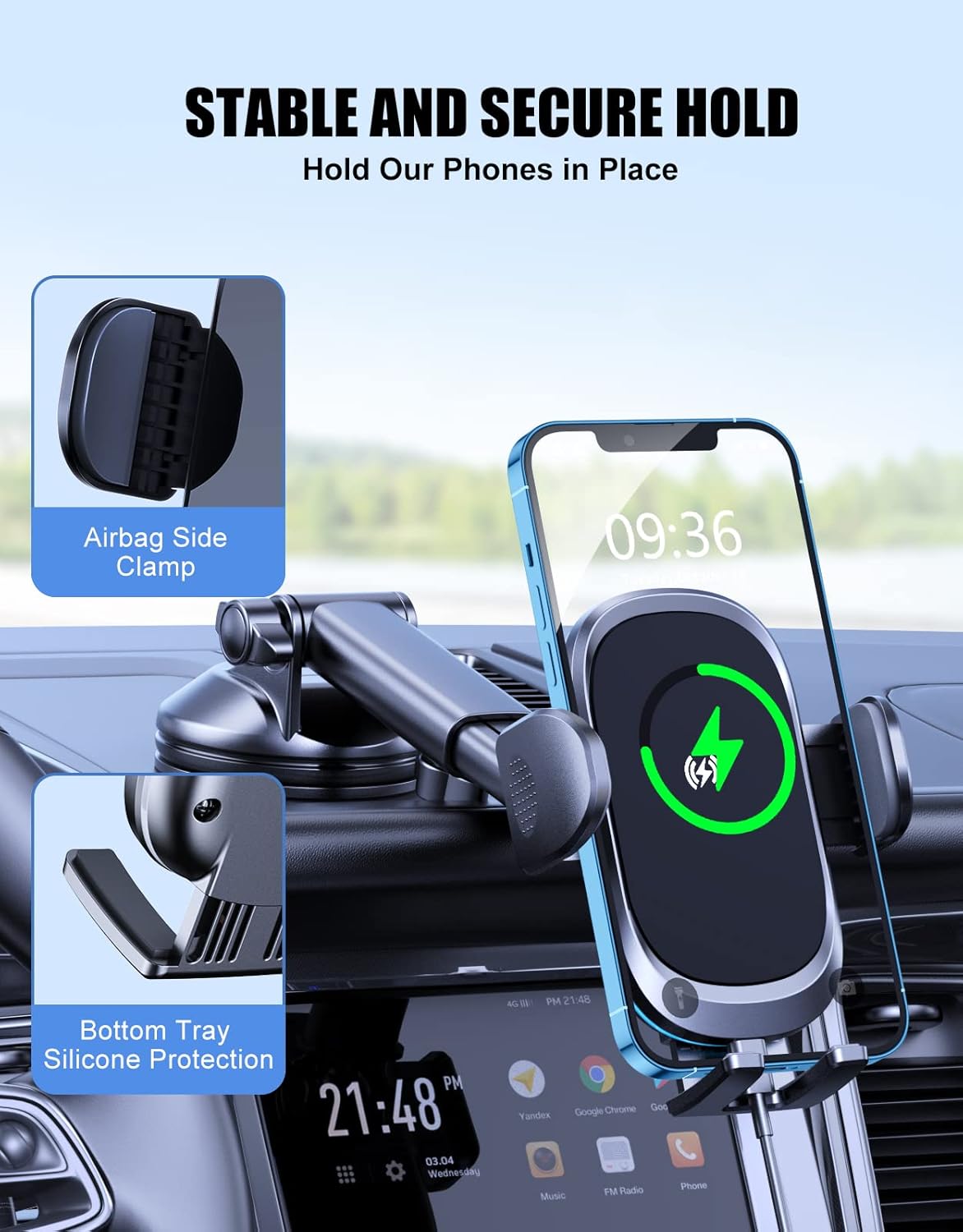 ✅[Never Fall Off] The wireless charging car mount features an extra-strong sticky gel suction cup that can be firmly attached to any flat surface. And the clips and feet on both sides are equipped with super soft non-slip rubber, forming a stable triangular structure, which can not only hold the phone firmly, but also effectively prevent the phone from bumping, scratching and abnormal sounds.