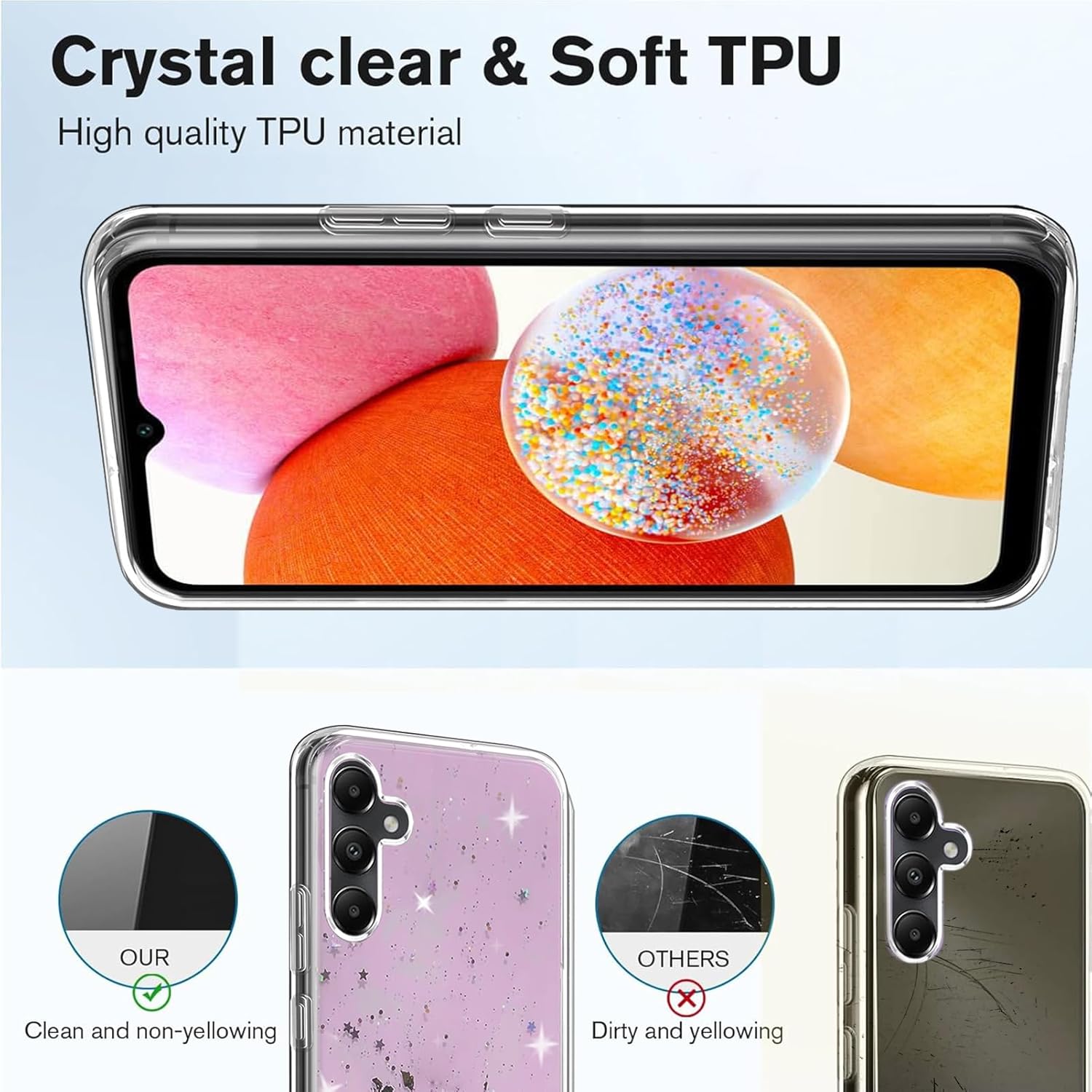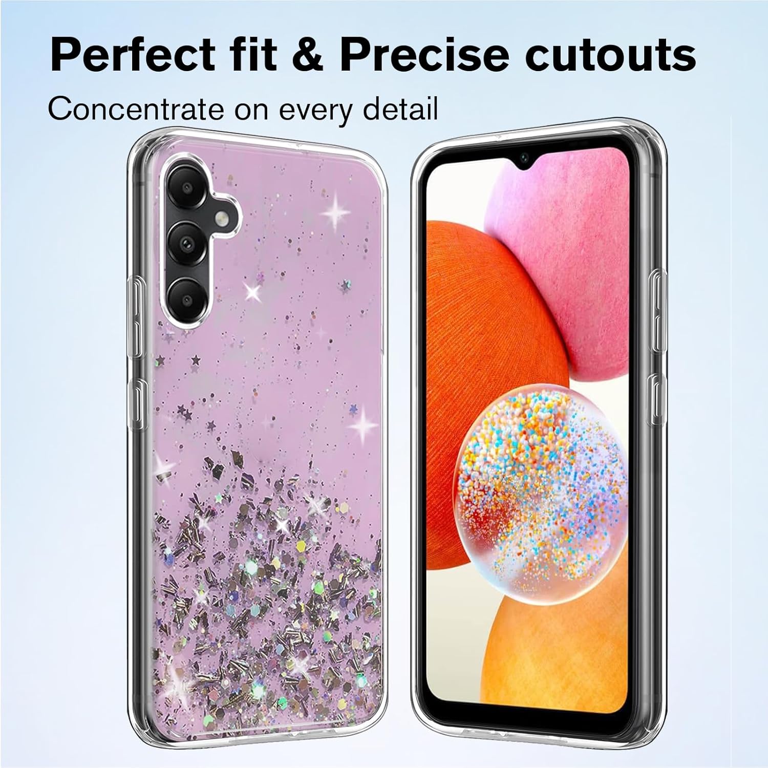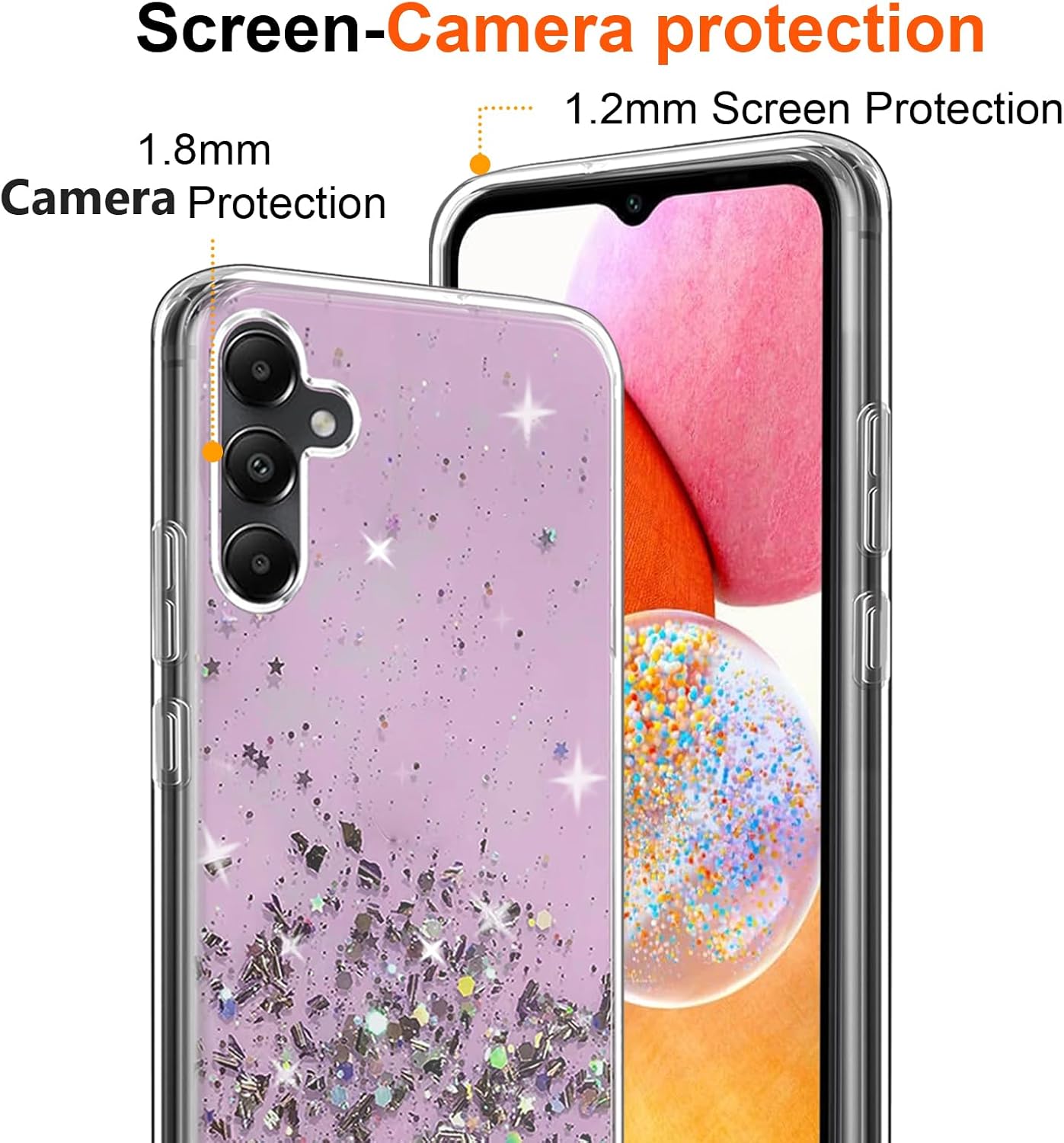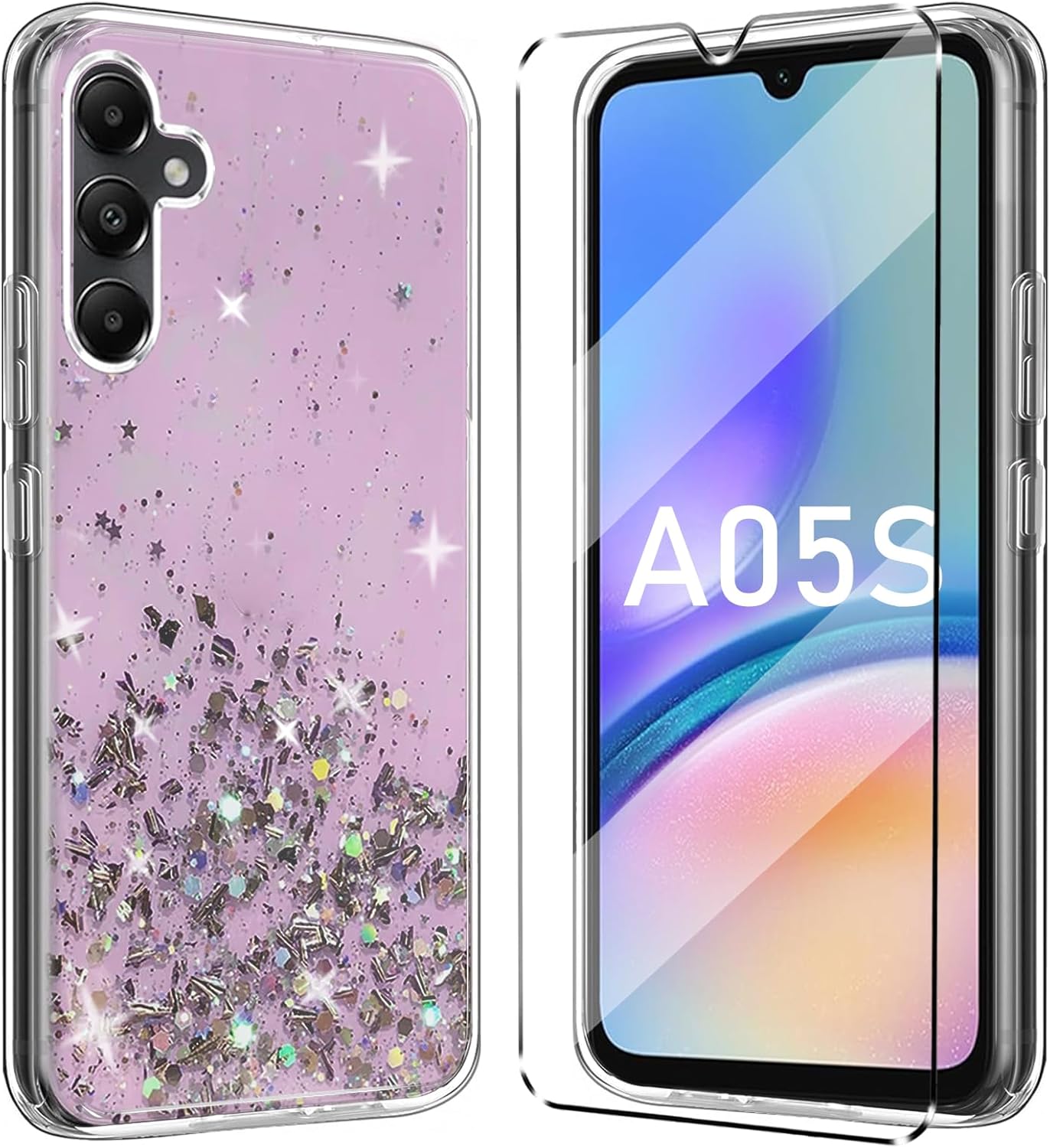 Features: 1. Our phone case is Only suitable for Samsung Galaxy A05S . 2. 100% soft TPU. Protect your phone against scratches and scrapes. 3. Slightly raised edges help prevent your Samsung Galaxy A05S’s screen and camera from rubbing against flat surfaces and getting scratched. 4. 100% precise holes, this case is firmly around your phone to ensure optimum protection. 5.Slim design makes it light weight and easy to carry. Better control your phone. 6. 9H hardness tempered glass Samsung Galaxy A05S screen protector is impossible to scratch and will help to protect your Samsung Galaxy A05S Phone from breaking. The package includes: 1 Pcs Soft Glitter Case for Samsung Galaxy A05S . 1 Pcs Tempered Film for Samsung Galaxy A05S . If you are not satisfied with our products, we have 30 days unconditional return policy