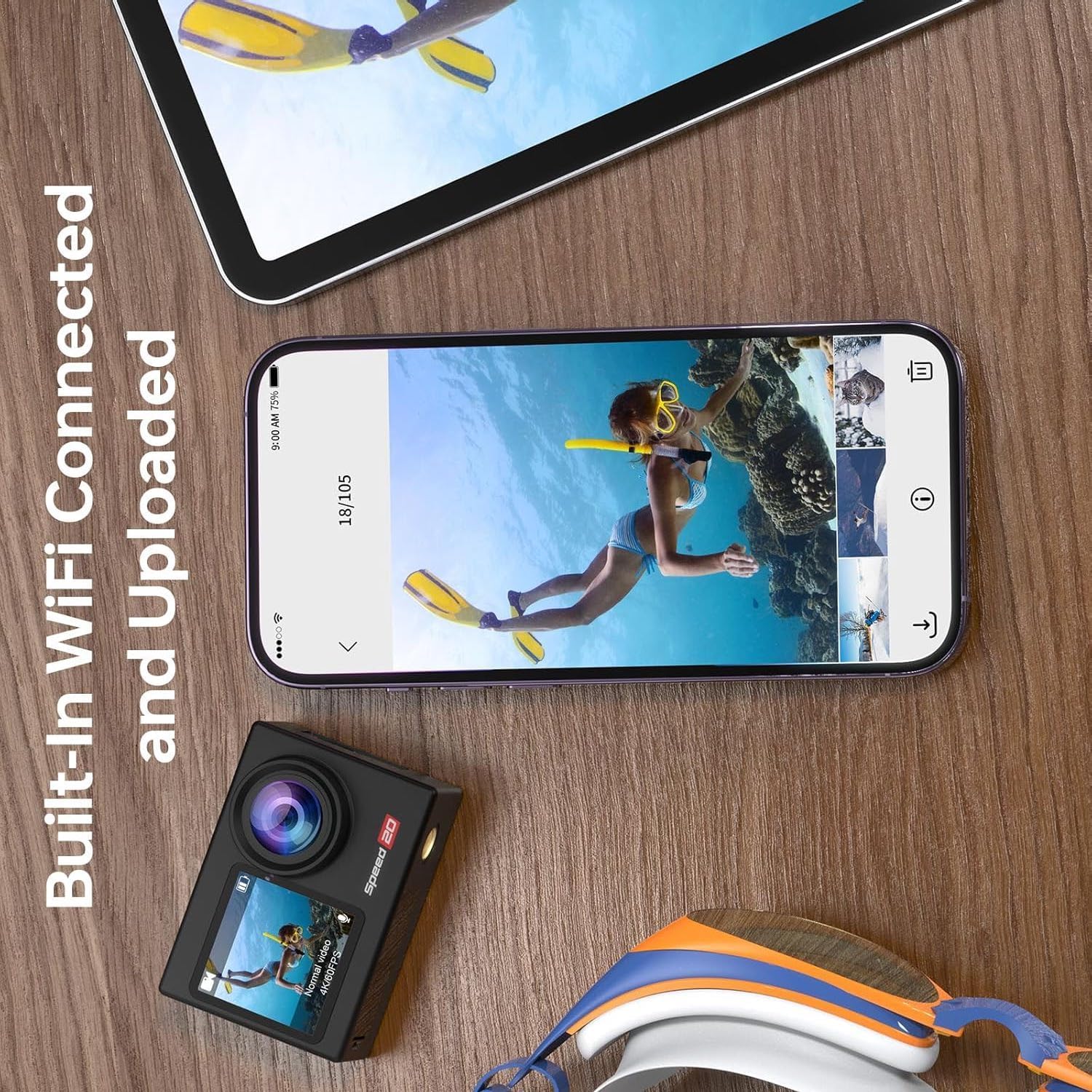 【Dual-Screen 4K Action Camera】 Capture cinematic 4K 60FPS videos and 20MP HD photos with Hiicam Speed 20. Features a 2 touch rear screen + 1.4 front screen for seamless selfies and framing. The 170° wide-angle lens ensures immersive underwater camera shots, perfect for snorkeling and action sports.