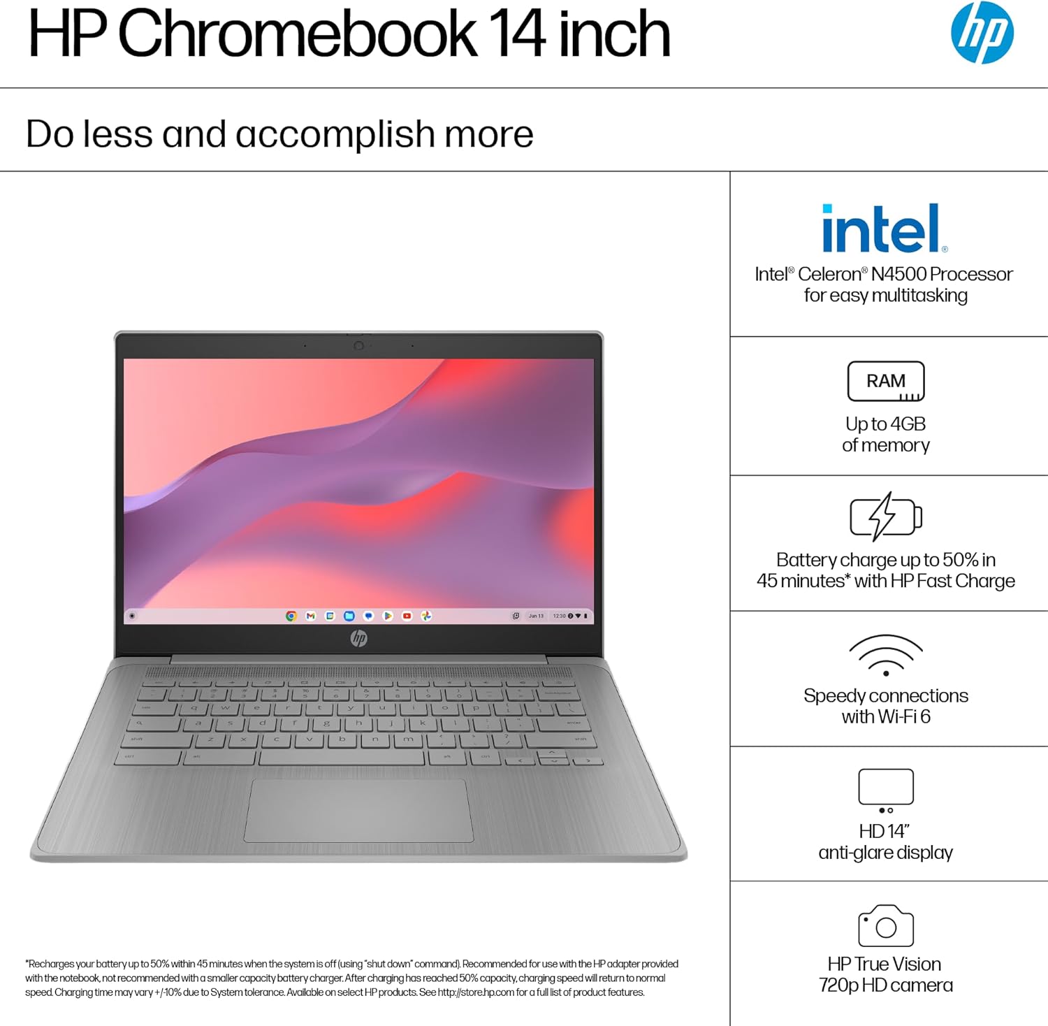 HP FAST CHARGE: When your laptop is low on power, no one has time to wait hours to recharge. Power down your device and go from 0 to 50% charge in approximately 45 minutes.