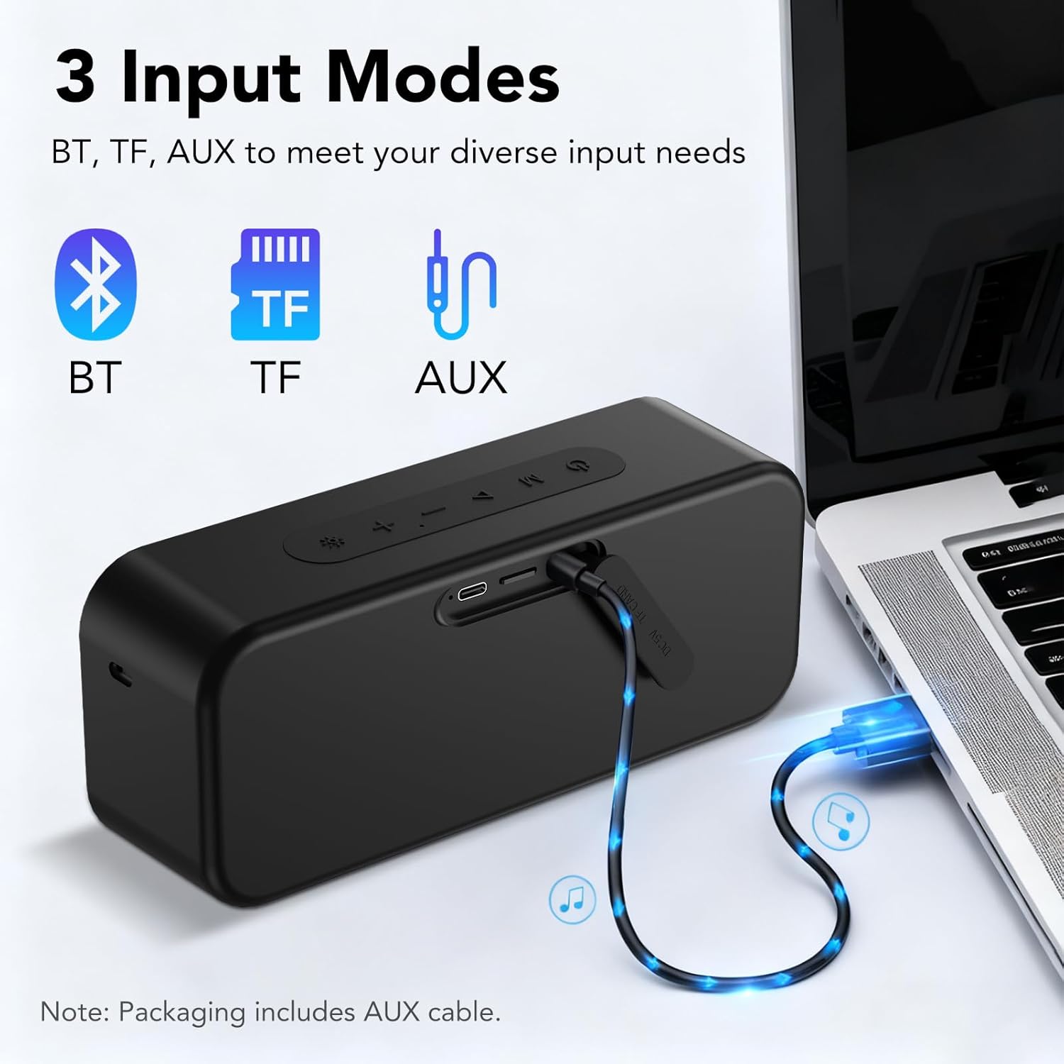 【Bluetooth 5.4 & 3-in-1 Connectivity】This bluetooth speakers utilizes the latest Bluetooth 5.4 technology, delivering an ultra-long wireless transmission range of up to 50ft. This ensures smooth, lag-free audio streaming. It also supports multiple playback modes including TF card and AUX wired input (cable included), micro SD card (supports up to 32G only), and USB. This allows easy connection to smartphones, tablets, computers, and TVs. The built-in microphone enables stable hands-free calling.