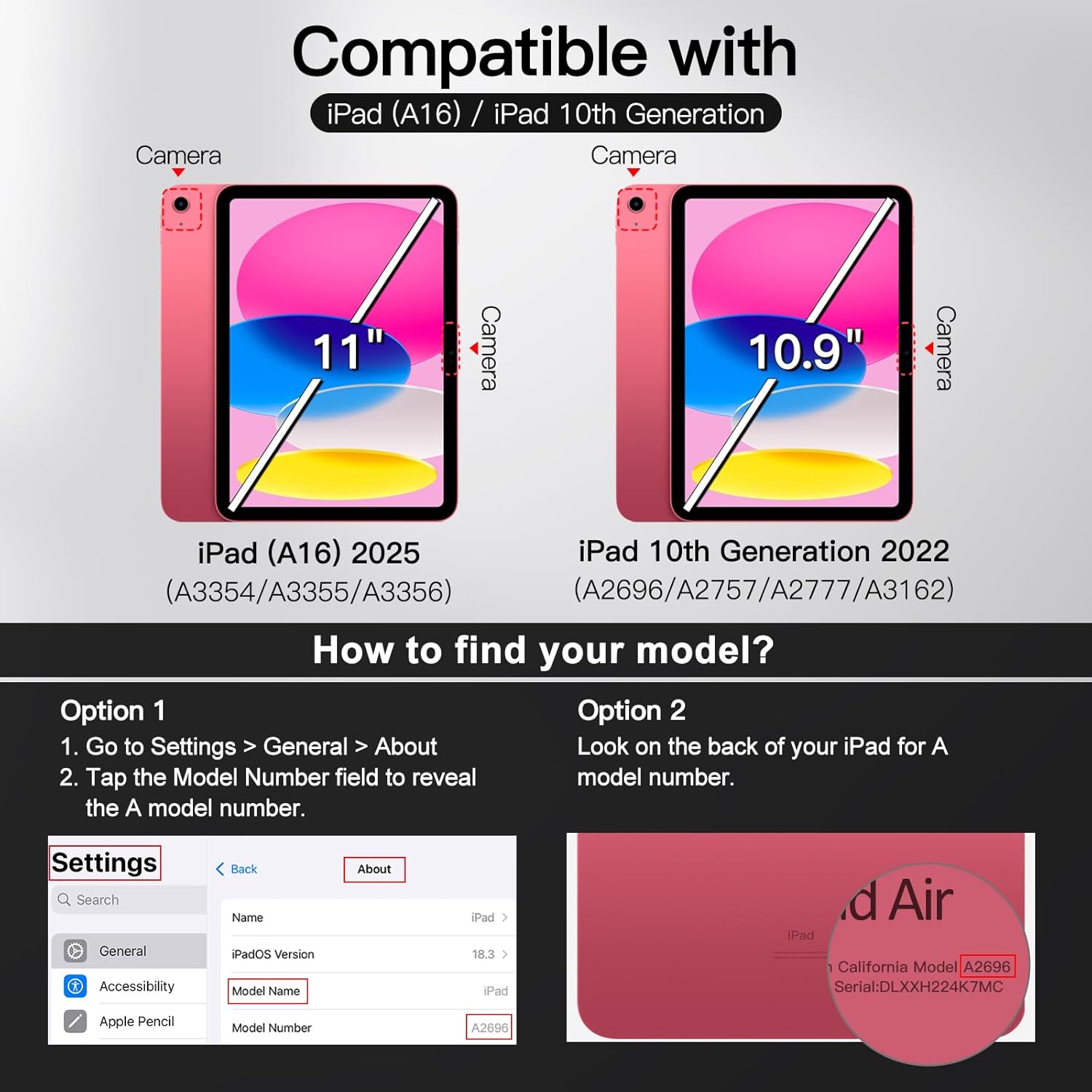 [Compatibility] Snugly fit for iPad (A16) 11th/10th Generation (2025/2022). Fit iPad Models: A3354 / A3355 / A3356 / A2696 / A2757 / A2777 / A3162. Please Go to Settings > General > About, then tap the Model Number field to reveal the A model number