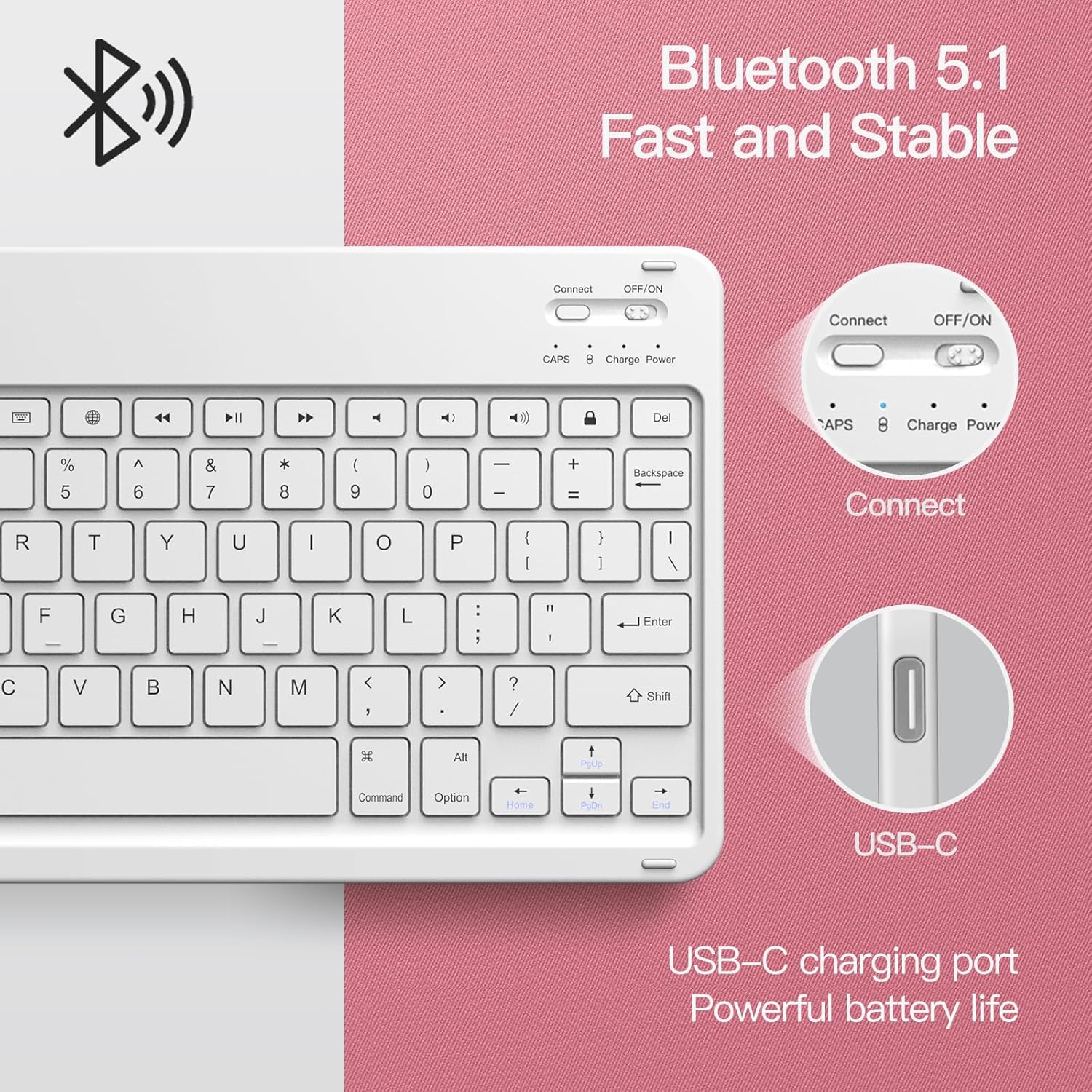 [Rechargeable & Long Life Battery] After 2-3 hour full charge, the wireless keyboard provides 90 hours of continuous operation and stands by for up to 150 days. Besides, an included USB C cable makes it convenient to recharge the keyboard