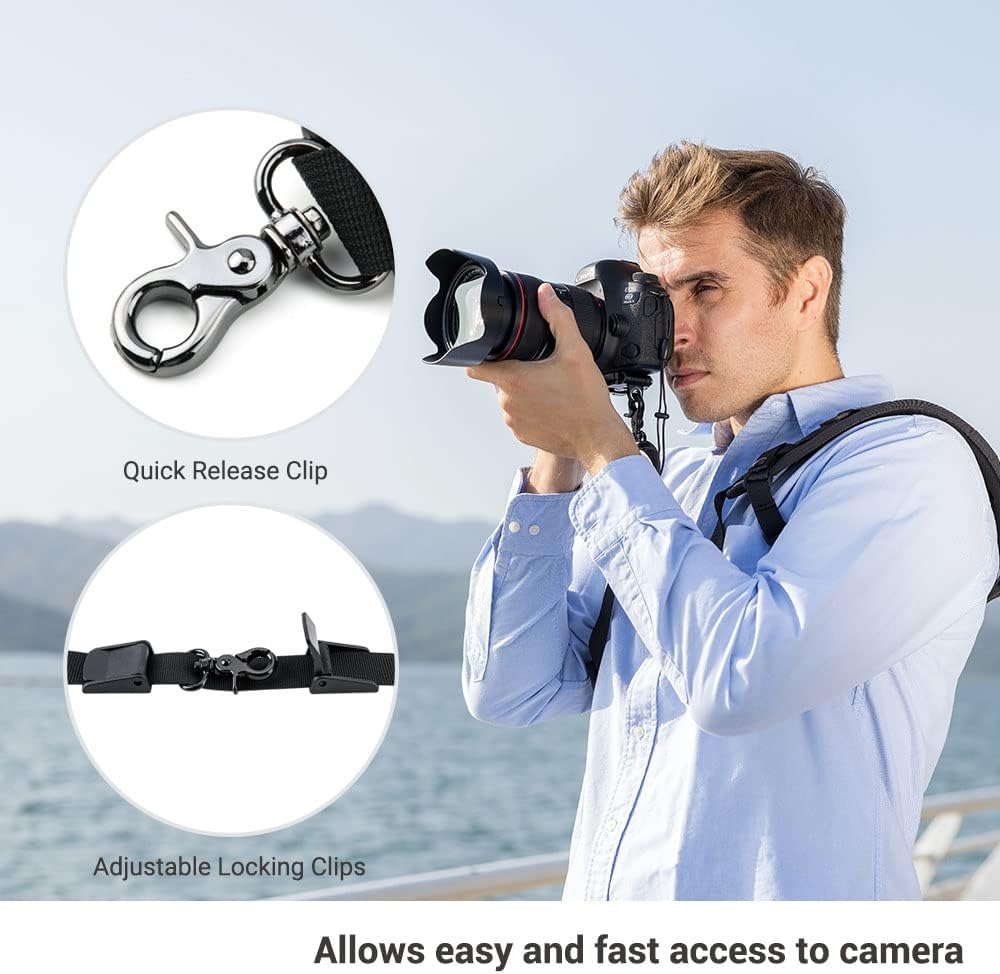 Two slideable locking clips for prevent your expensive camera swing around or slip. Easy to adjust a proper position for shooting.
