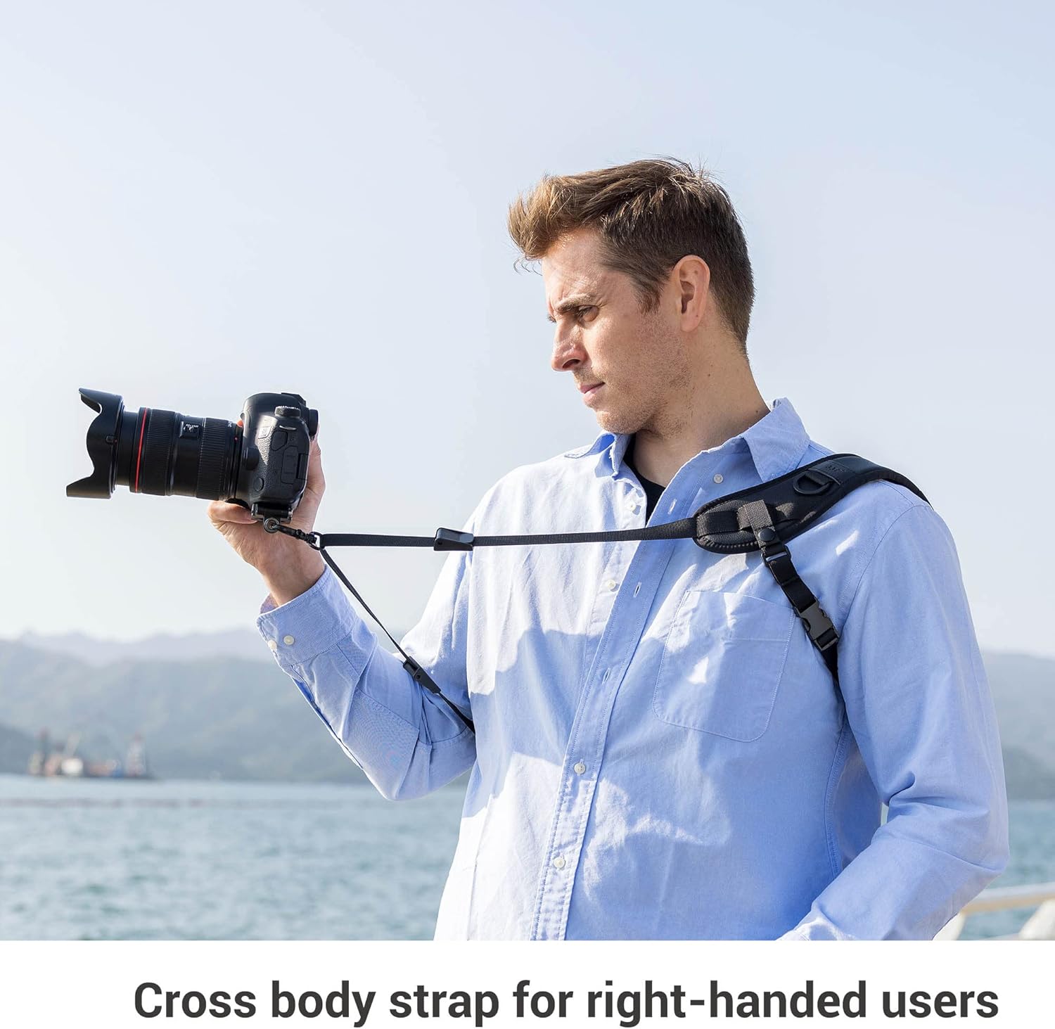 It is a cross body strap for right-handed users. Arca Swiss Type quick release plate can be mounted to a Arca Swiss Type tripod system. Adjustable length from 28.3 to 48.8″ (72 to 124cm), Comes with a safety string. Adjustable Quick Release Sling Strap with Safety String Compatibility with All DSLR Camera, Camcorder and especially designed for heavy cameras with standard ¼” tripod stud screw.