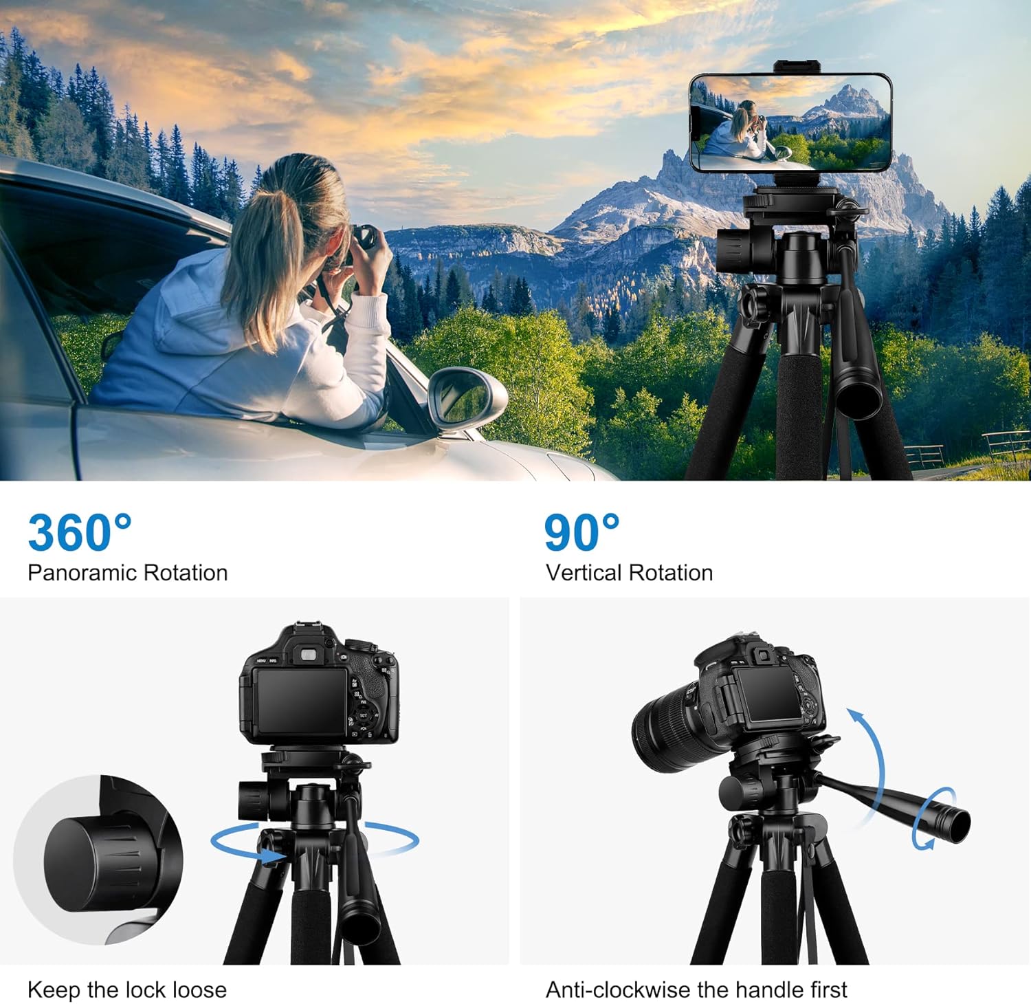 『360 Degree Swivel Ball Head』Built-in bubble level and 3-way pan head allows for tilt and swivel adjustment, easily to choose portrait or landscape options. The tall camera tripod support 360°panoramic shooting and 90° vertical shooting