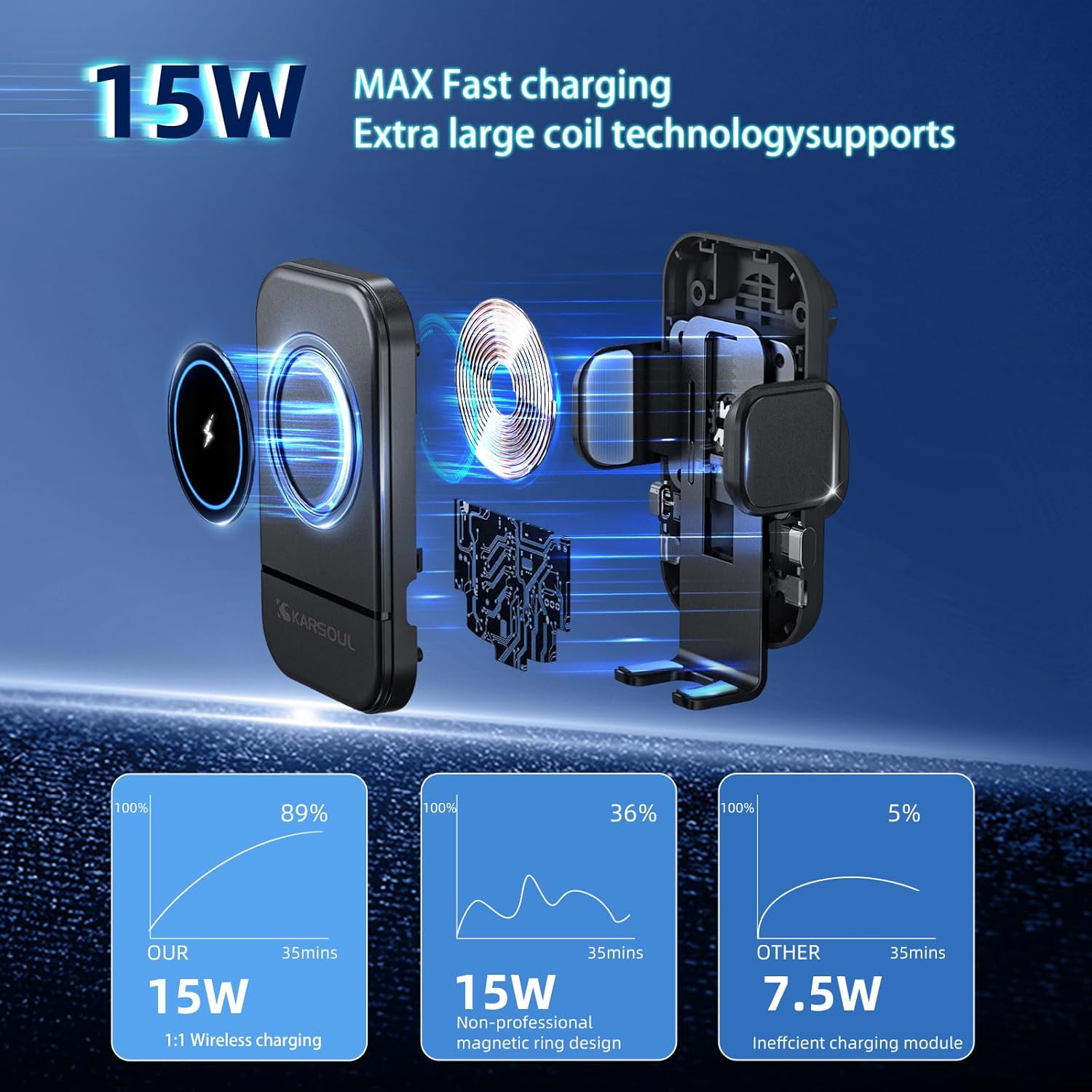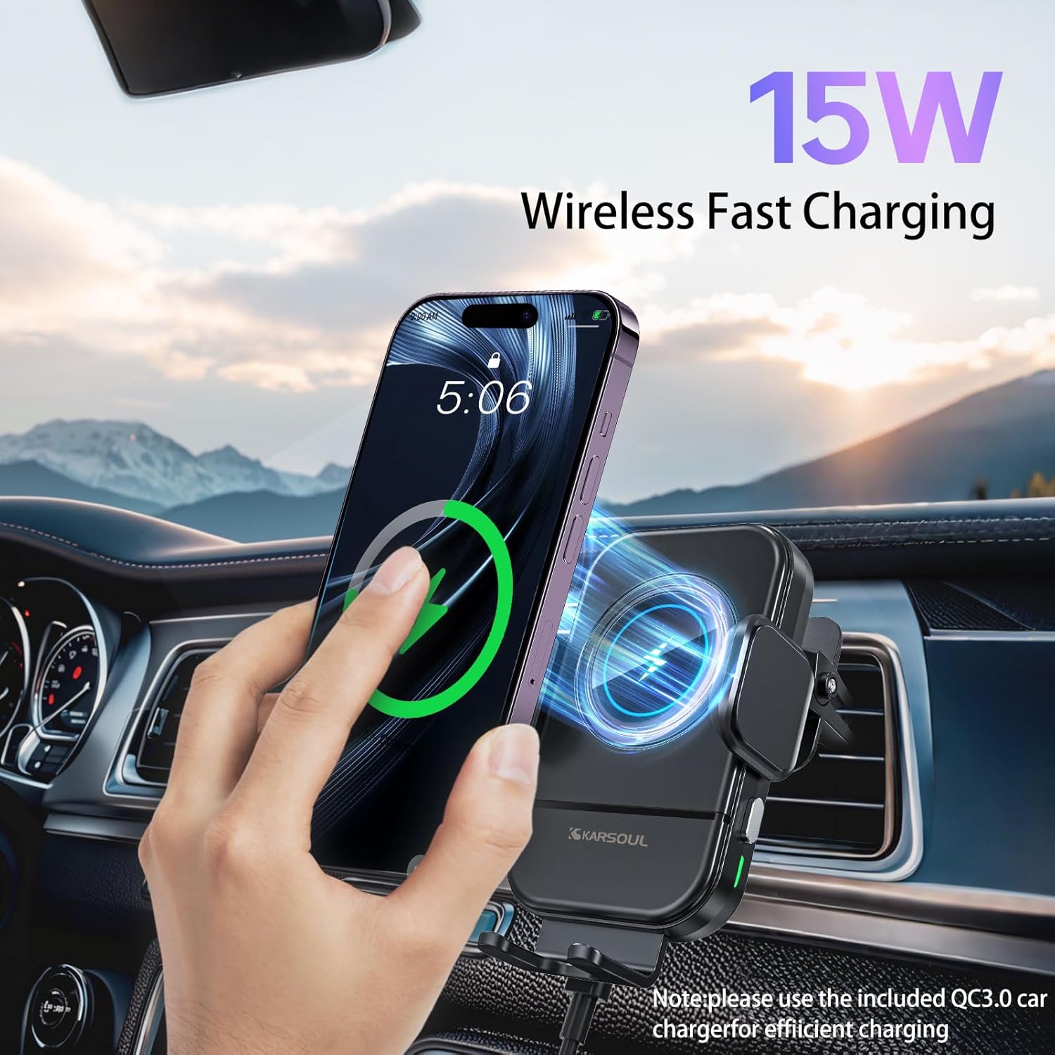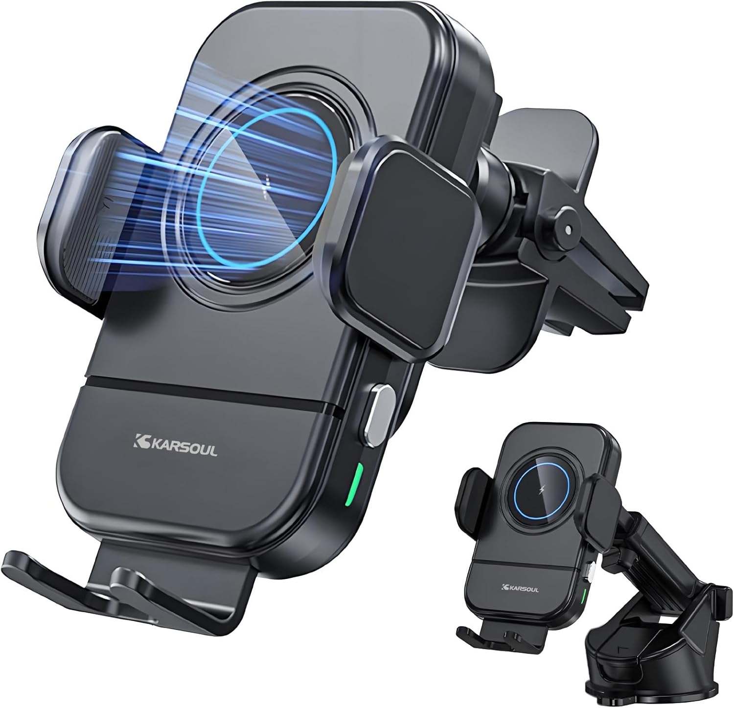 The Karsoul mount securely holds any phone, with or without wireless charging, for versatile use in any vehicle.