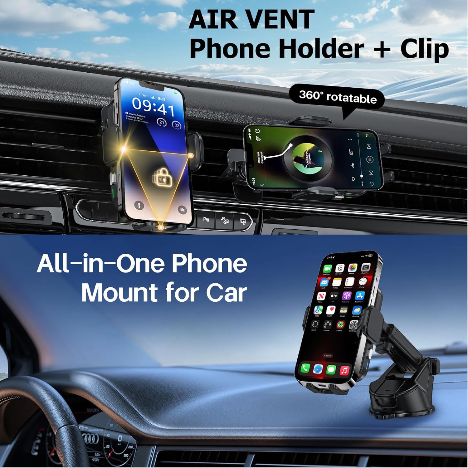 1.【Car Phone Holder with Auto-Clamping】 Smart-sensing U-shaped arms securely hold your phone in approximately 0.5 seconds, designed for a firm grip on bumpy roads. Anti-slip silicone pads help keep your device stable, ideal for daily commutes or off-road drives. (Not compatible with foldable phones.)