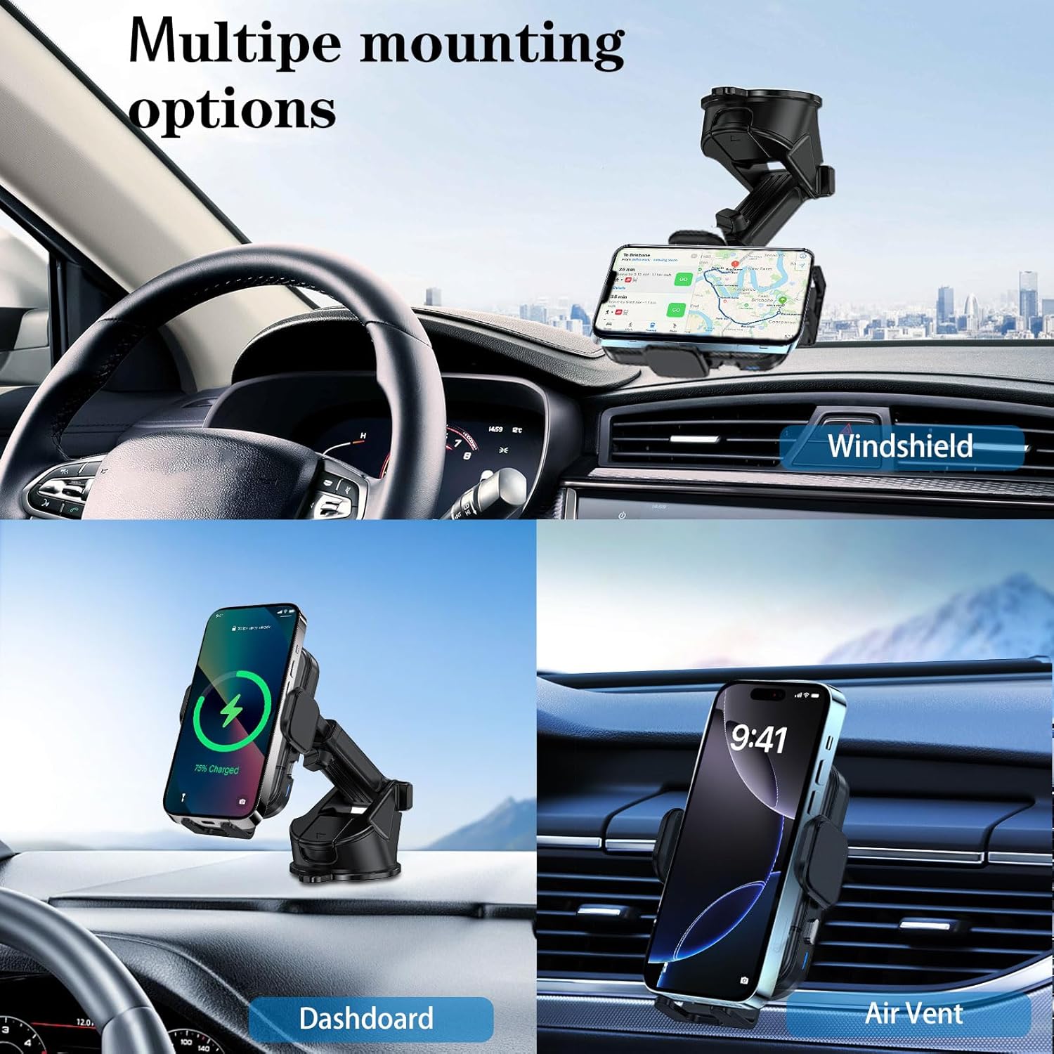 2.【Wireless car charger Installation Options】 Features a vacuum suction cup and anti-slip silicone pads to mount on dashboards or windshields, designed to handle various driving conditions like rough roads or sharp turns. Includes an air vent clip for flexible installation in most car types.