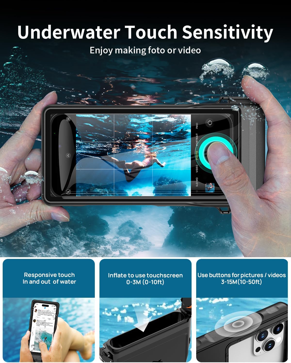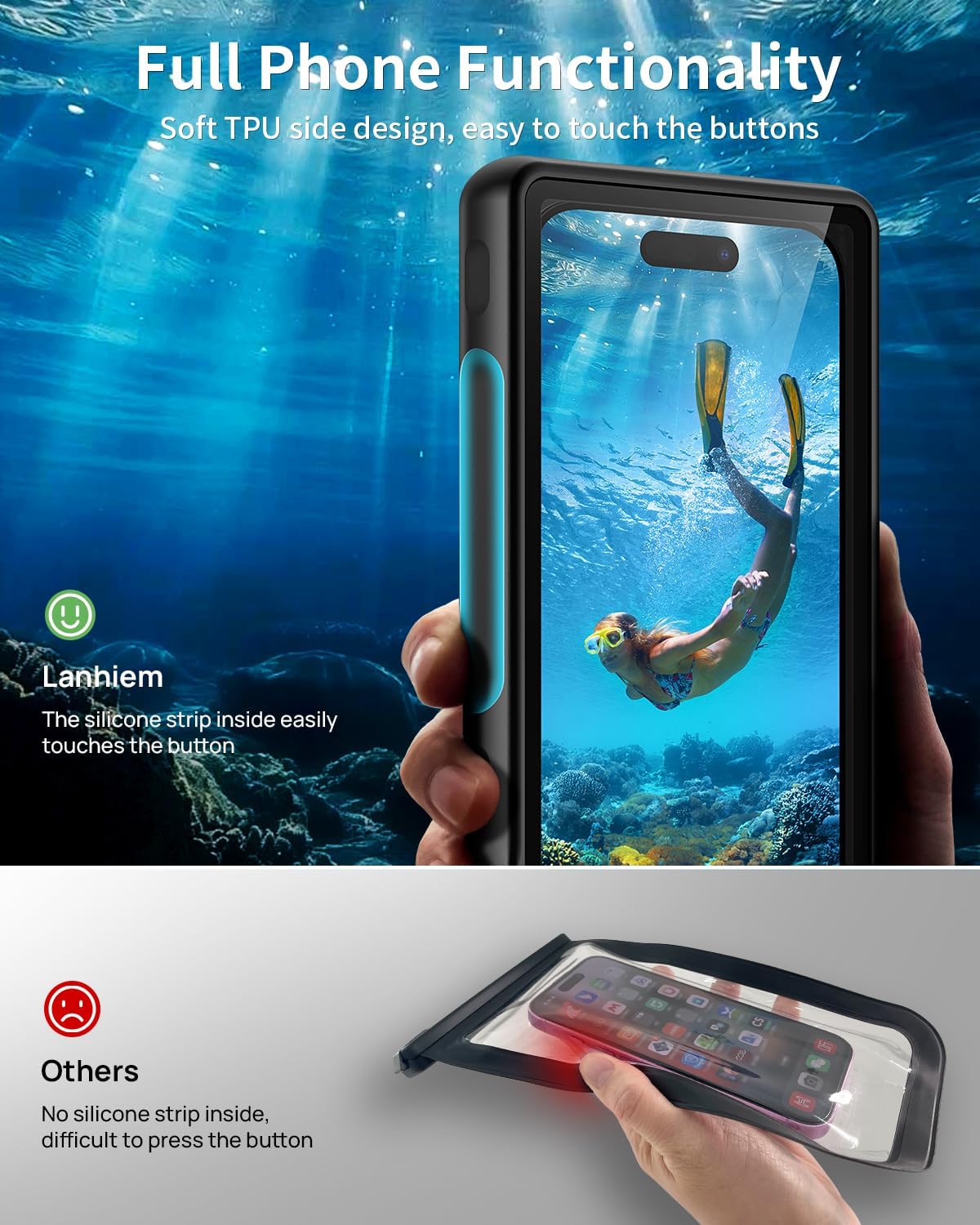 【Highly Sensitive Underwater Touchscreen】The waterproof phone case is made of high-quality PVC instead of TPU. It is more sensitive to touch and pressure, supports calls, photos, Face ID, and all other applications (except fingerprint). Note: Due to water pressure, it is normal that you cannot operate the screen in deep water. Don’t worry, you can use the volume buttons to take a photo.