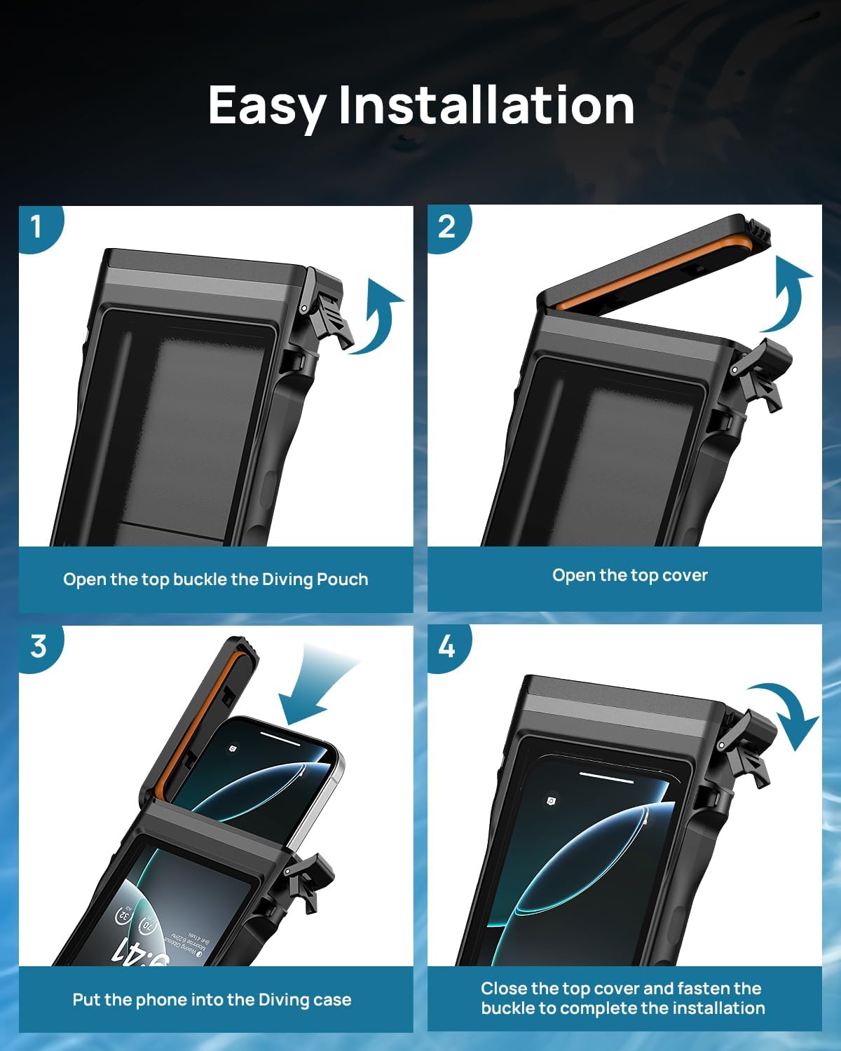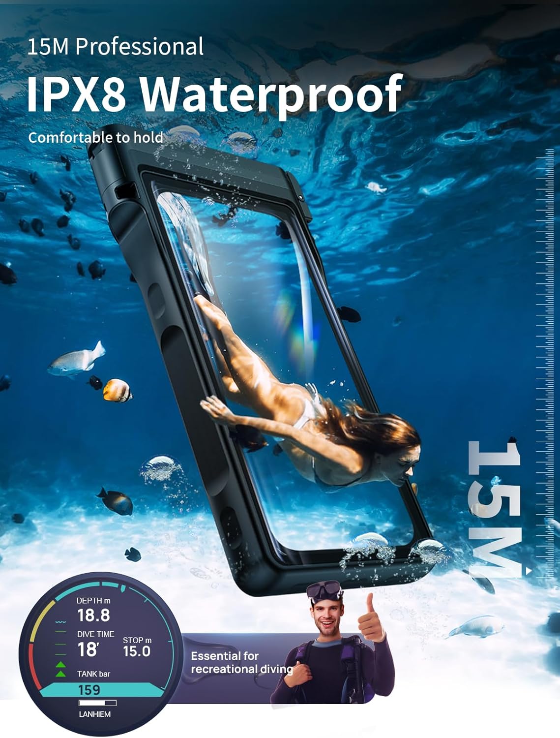 【IPX8 WATERPROOF 15M】The IPX8 waterproof mobile phone case, snap-on clip and seamless heat press technology ensure a perfect seal. It can protect your mobile phone from water, snow, sand and dust (up to 15 metres deep). This means you have your hands free at all times – outdoors, when travelling, in the bathroom, etc. Tip: Please use a paper towel to test the waterproofing before use. This is very important to protect your mobile phone.