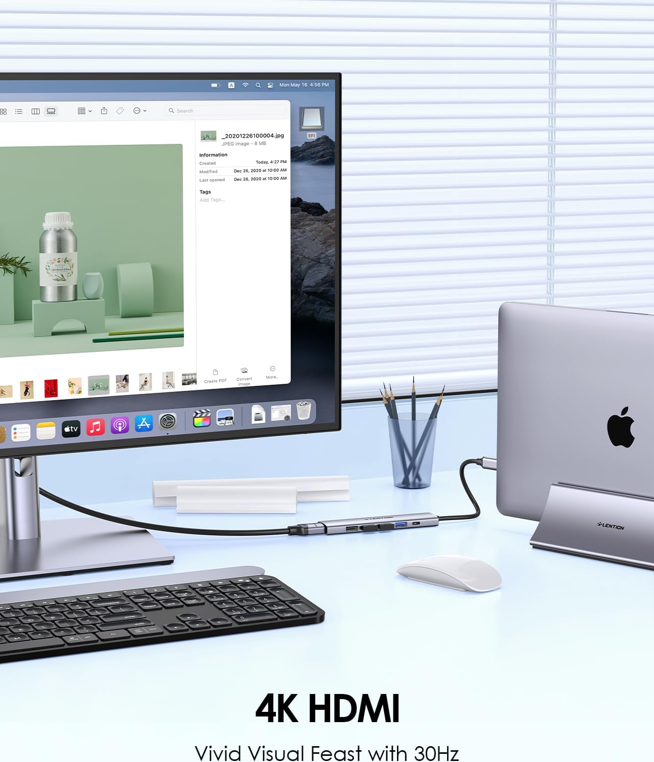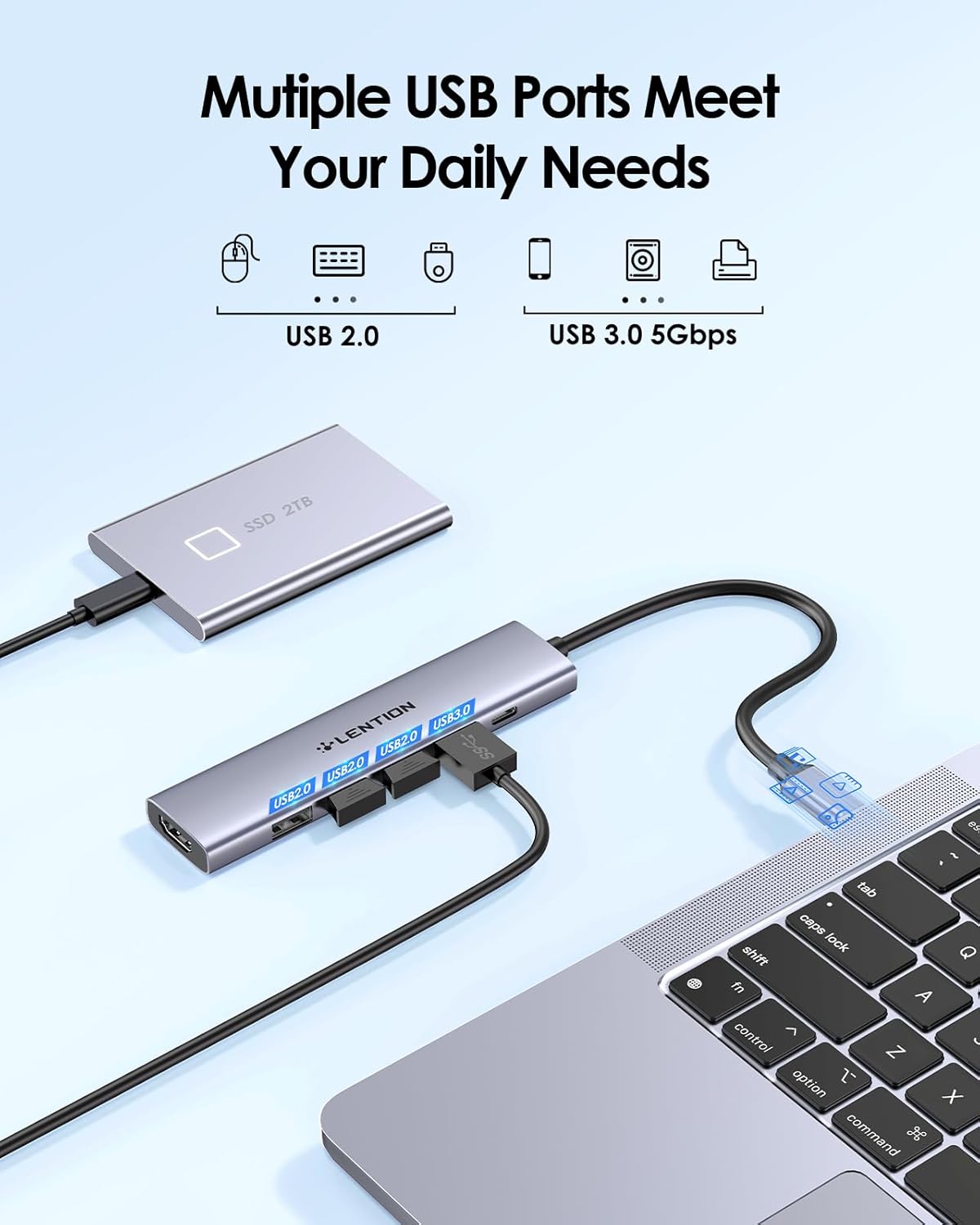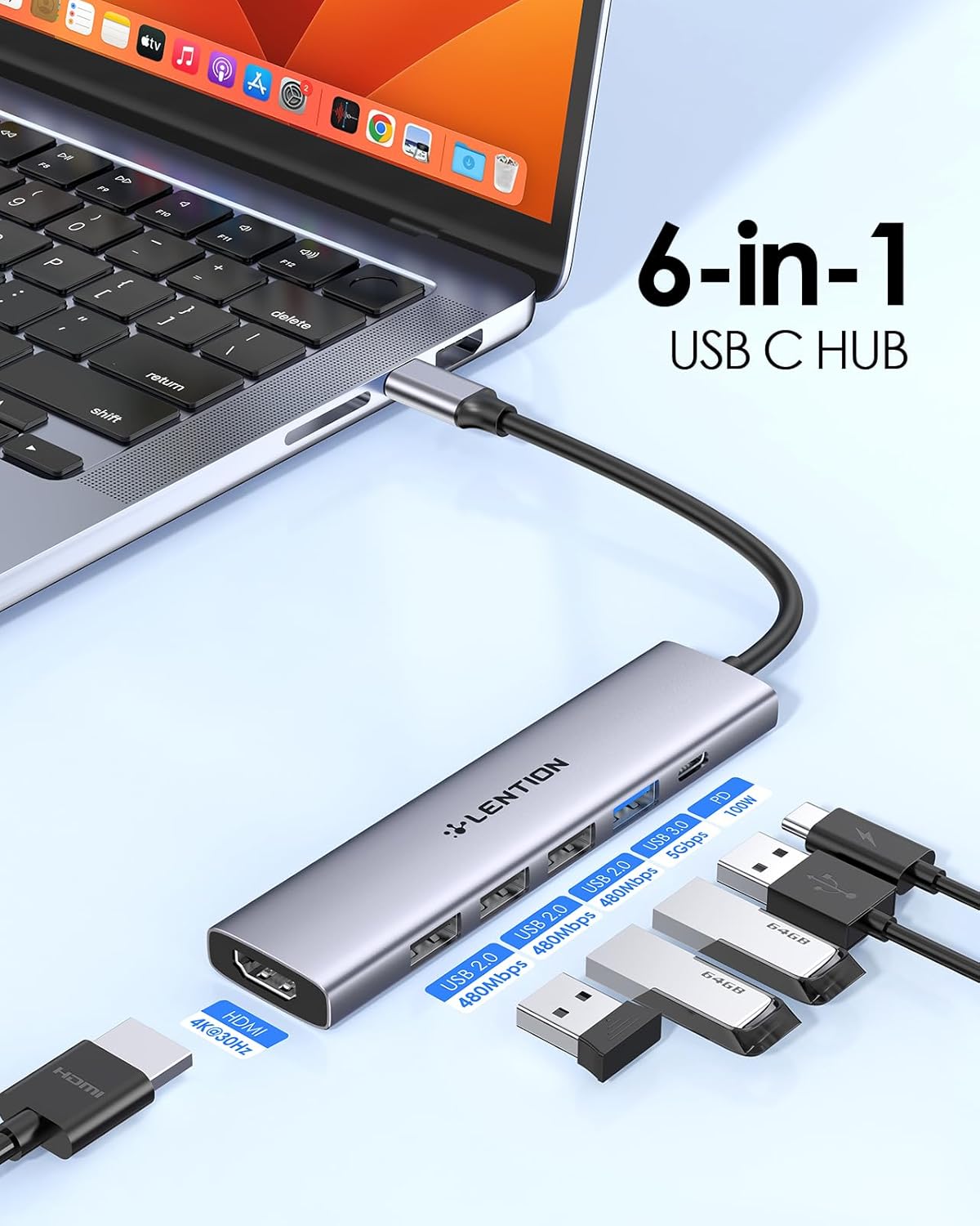 6-in-1 USB C Hub Expansion – LENTION USB C Multiport Hub features a 100W Type C charging port, a 4K@30Hz HDMI output port, a USB3.0, and 3 USB 2.0 ports. All the ports can work simultaneously, slim yet powerful.
