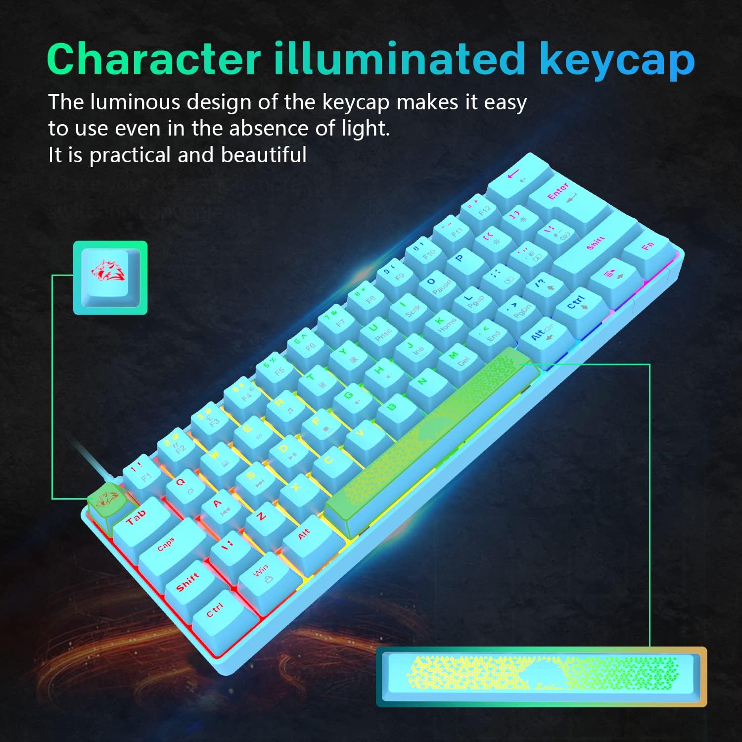 【Custom keycap】 We designed a cool wolf head on the ESC button as the LOGO, and used the honeycomb concept design on the space bar. In the dark, the keyboard will emit cool visual lighting effects, which is very suitable for gifts at home children or use by themselves.