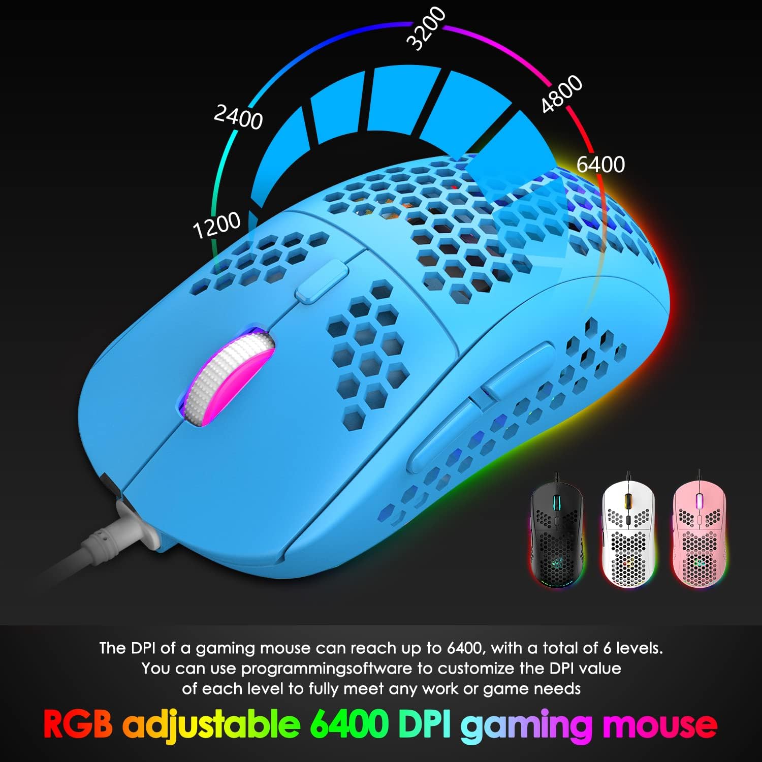 2. Customize DPI Switch:800 -6400DPI. (6 level adjustment)