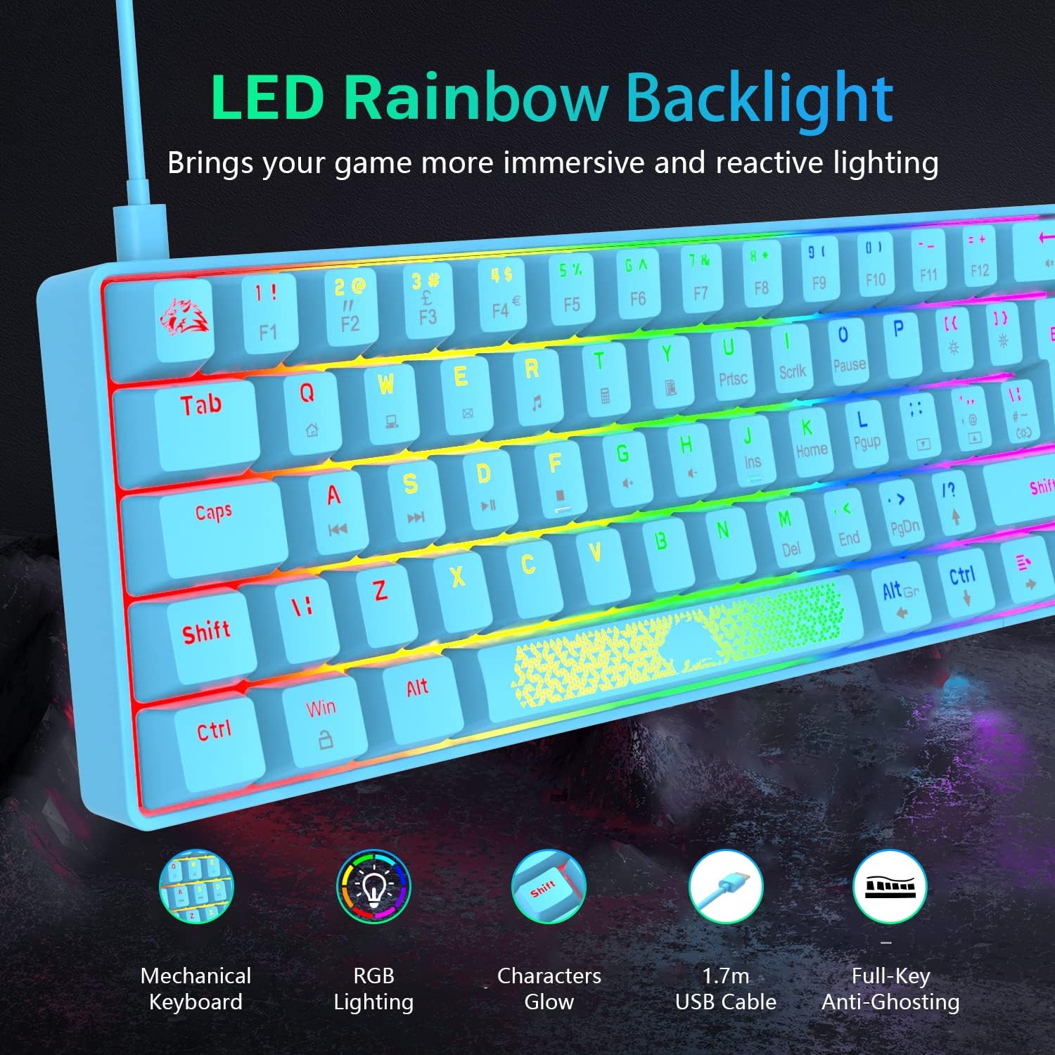 【Rainbow Backlight Gaming Keyboard】Rainbow backlit mechanical gaming keyboard, Press FN+ to switch between 19 lighting effect modes, backlight brightness levels, adjustable breathing speed. The keycaps offering clear uniform backlighting WIN key can be disabled for gaming. The PC Gaming Keyboard has been ergonomically designed to be a superb typing tool for office work as well. The gaming Keyboard is built to withstand the average liquid spill.
