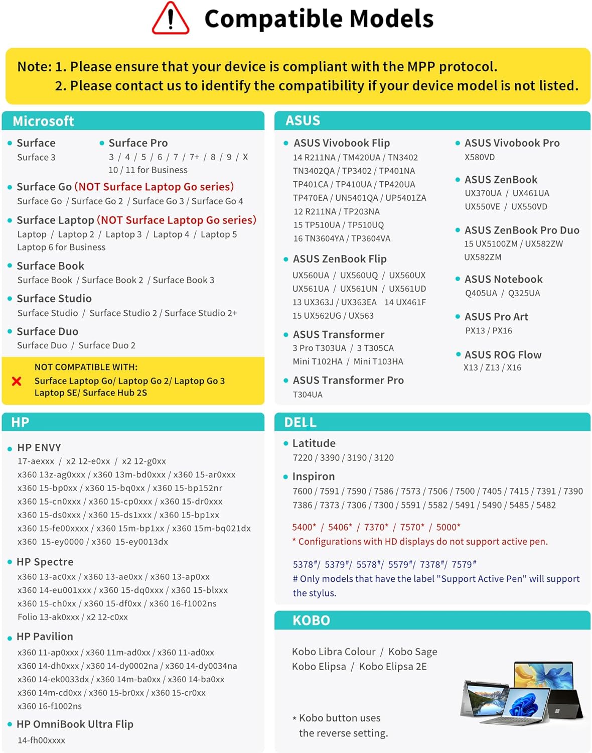❤【Make Sure your Model is Compatible】: Contact us with your device model if you are unsure about compatibility. The M1 supports up to MPP 2.0 protocol and is compatible with most Microsoft surfaces and some models from HP, ASUS, DELL and Kobo. [Model List] Surface Pro 3/4/5/6/7/8/X, Surface Book/Bk 2/Bk 3, Surface Laptop/Laptop 2/3, Surface 3, Surface Go/Go 2/3, Surface Studio/Studio 2; HP Envy x360 Series, HP Pavilion x360 Series, HP Spectre x360 Series; Kobo Libra Colour, etc