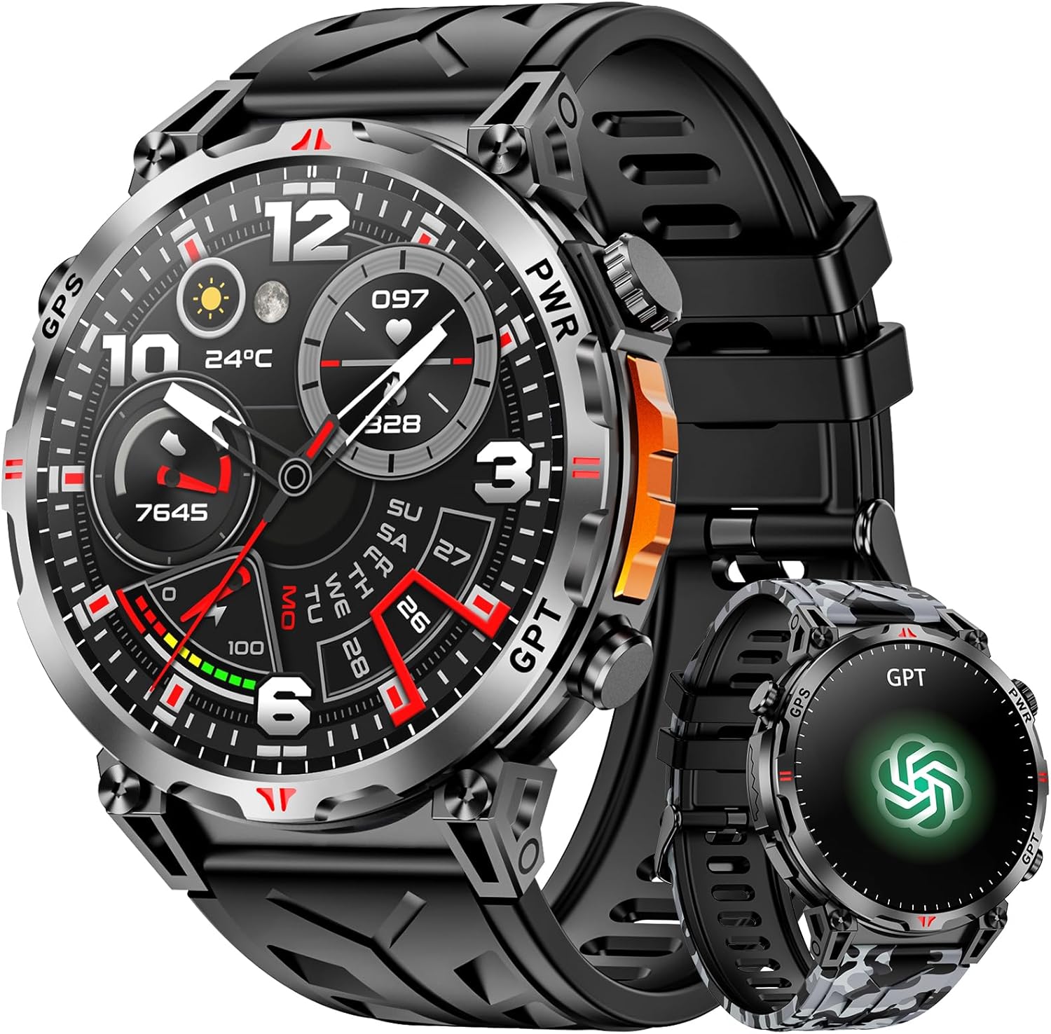 ⌚【EXCEEDING YOUR EXPECTATIONS】Package contents: smartwatch*1, black silicone band*1, camouflage silicone band*1, USB magnetic charging cable*1, English user manual*1. If you have any questions, please feel free to contact us anytime. Our professional service team will reply to you within 24 hours and provide you with the best solution.
