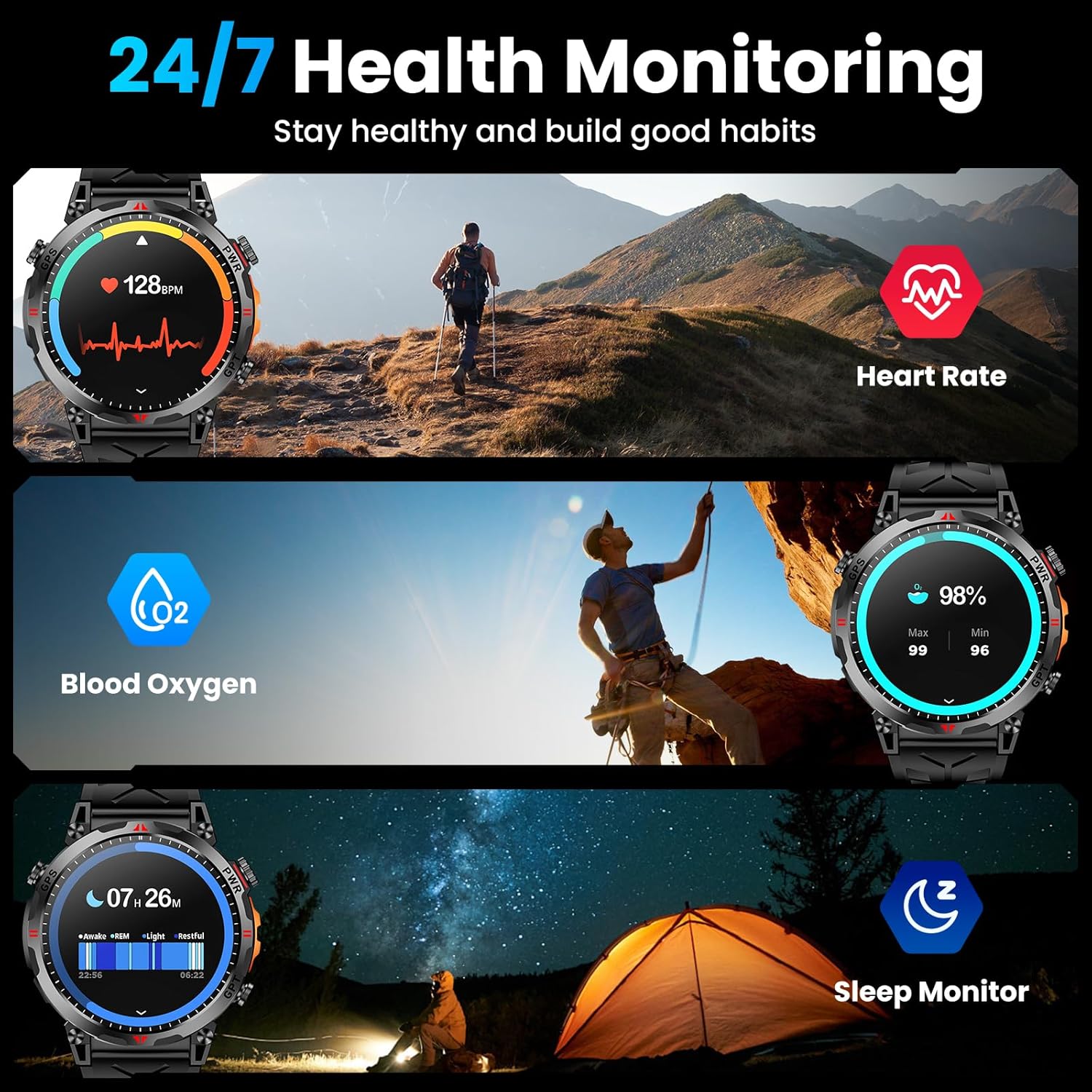 ⌚【1.56″ AMOLED Display & All-Zinc-Alloy Frame】This smartwatch is equipped with a 1.56-inch scratch-resistant AMOLED display that stays crystal-clear even in direct sunlight, delivering sharper, more stunning visuals. The seamless, full zinc-alloy housing blends refined looks with rugged durability, engineered to withstand extreme heat, low-pressure operation and dust. Two strap options—black silicone and camouflage silicone—let you match any outdoor style.