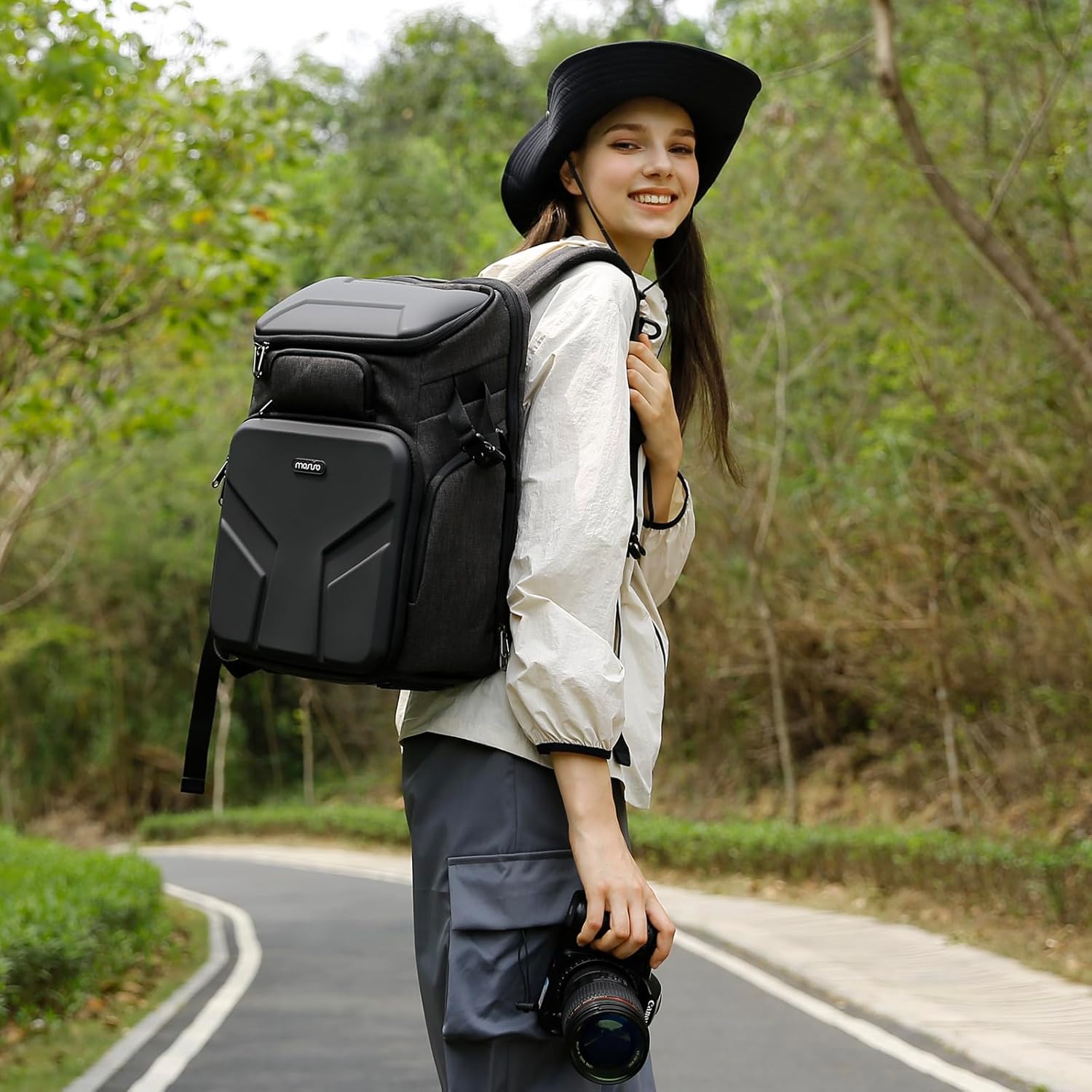 MOSISO 17.3 inch Camera Backpack with Front Hardshell is designed with laptop compartment, tripod holder and rain cover, suitable for outdoor travel, wedding, photography vlog.