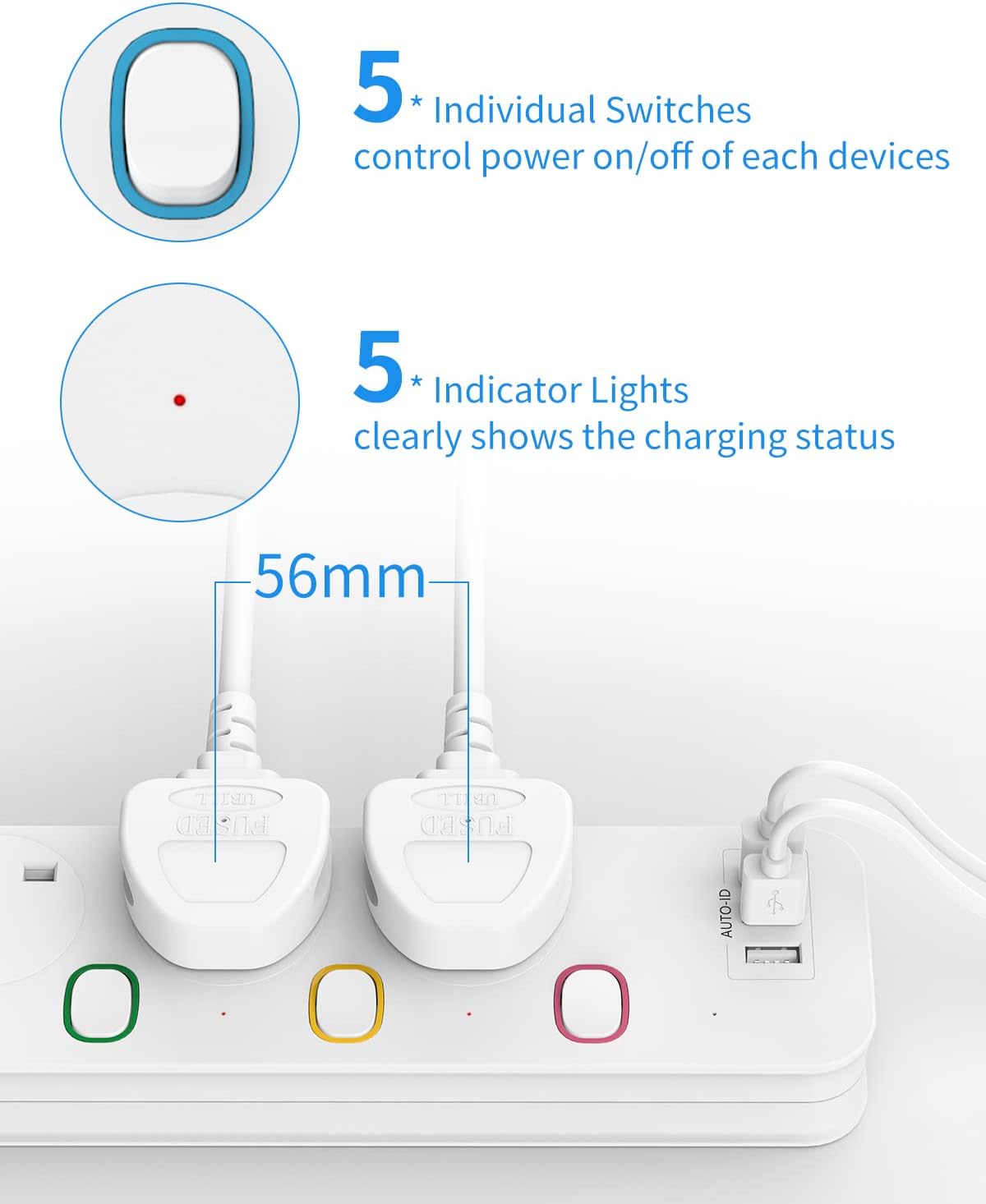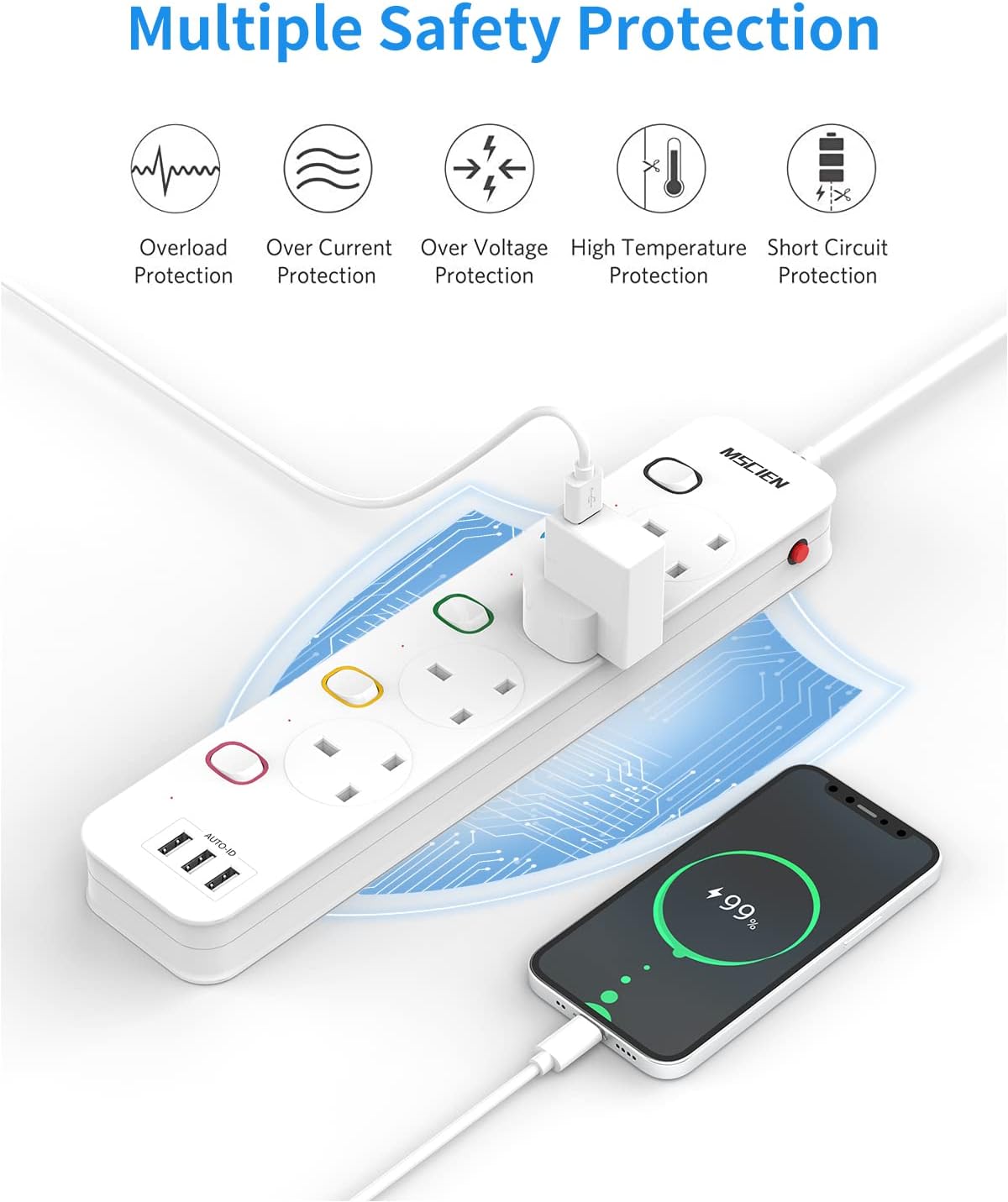 【Safety First】Mscien extension lead comes with a Standard UK plug with a 13A Fuse in plug head, meeting the criterion of BS1363/A. Child-protective safety door keep children safe from electric shock of careless touching. Built with 750°C flame-retardant material.